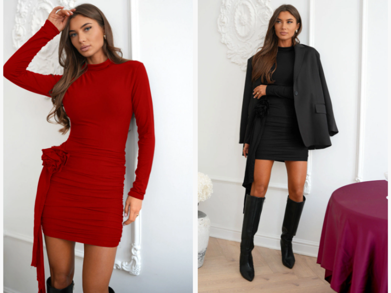 Jeśli wolisz krótsze fasony, zerknij na sukienkę mini z ozdobnym kwiatem SHIORI. Masz tu do wyboru cztery świetne kolory - klasyczną czerń, głęboką czekoladę, bordo oraz soczystą czerwień - więc łatwo dopasujesz ją do swojego typu urody. Ten kwiat przy pasie robi całą robotę i sprawia, że sukienka nie potrzebuje już właściwie żadnych dodatków. Wiskozowa sukienka SHIORI rewelacyjnie wygląda w „warstwowym” wydaniu: z botkami i dużym, oversizowym swetrem zarzuconym na wierzch. To taki miks zimowej przytulności z odrobiną wiosennego klimatu, który możesz nosić bez względu na datę w kalendarzu