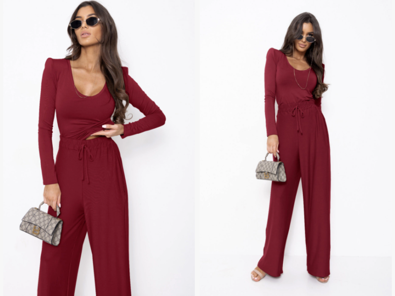 Komplet AGRA w kolorze bordowym to świetny wybór na dni, kiedy chcesz czuć się swobodnie, ale wciąż wyglądać kobieco. Ten głęboki odcień bordo genialnie pasuje do jesienno-zimowego klimatu. Bluzka ma dekolt w serek, który fajnie wysmukla, a spodnie mają szerszą nogawkę, co daje mnóstwo wygody, gdy jesteś w ruchu.