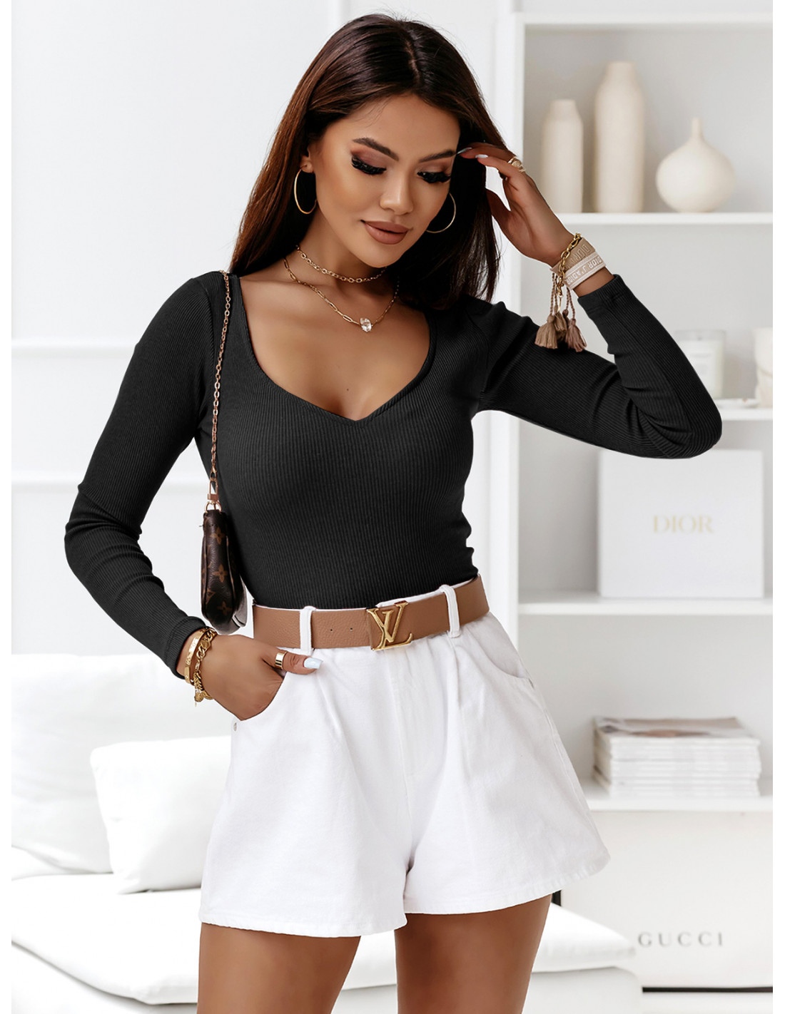 Prążkowana bluzka z głębokim dekoltem - SORIA - czarna