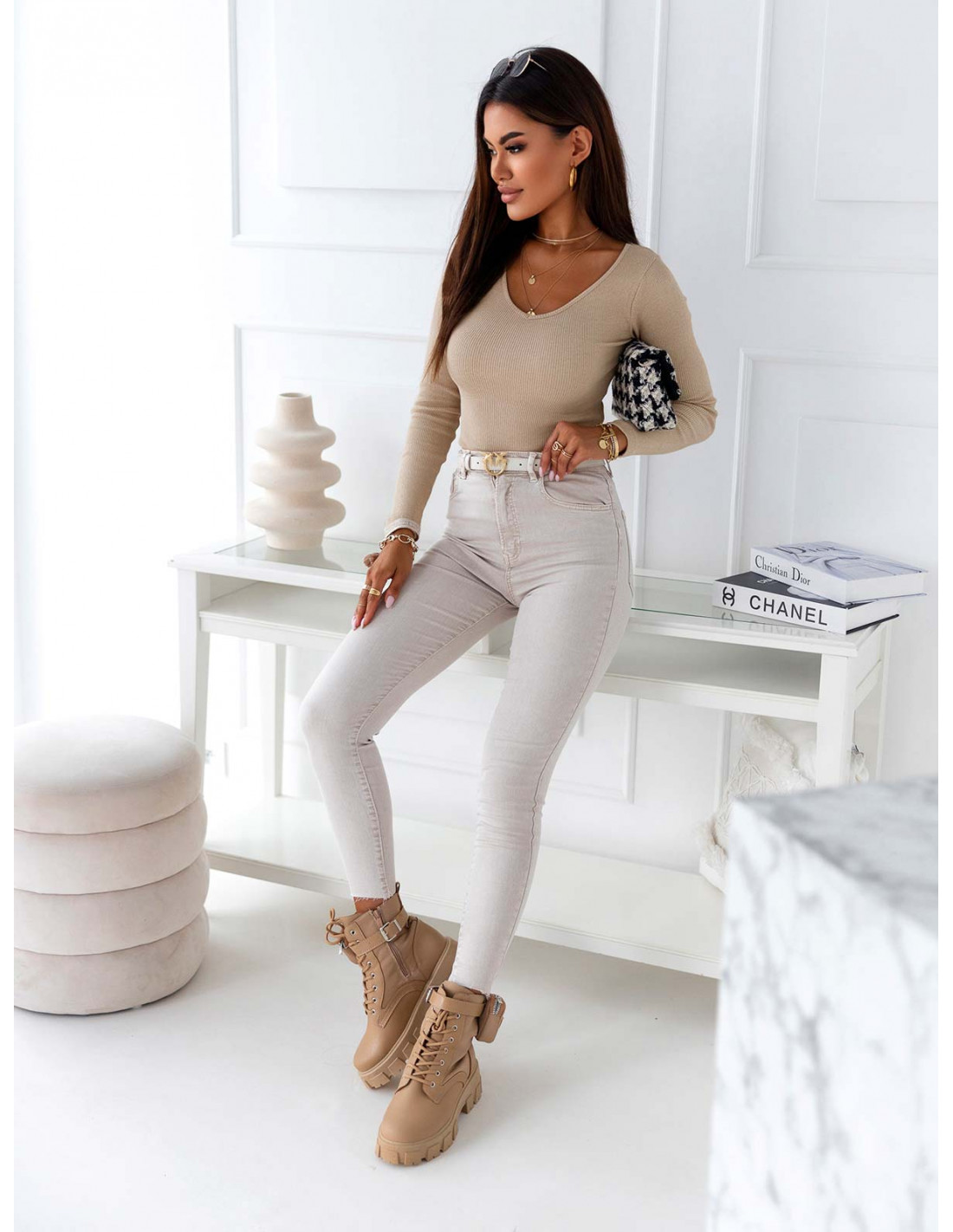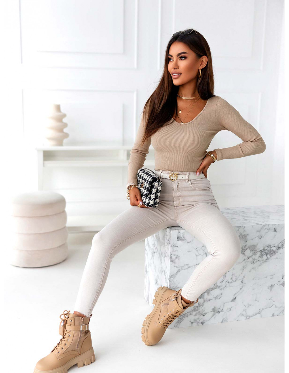 Prążkowana bluzka z dekoltem w serek KARI - jasny beż