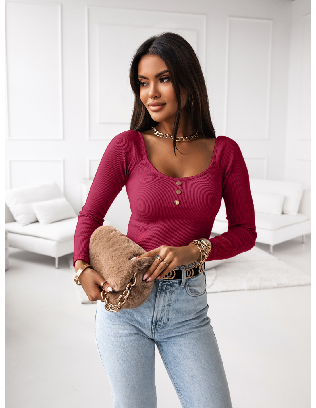 Prążkowana bluzka z ozdobnymi guzikami - HATTIE - fuksja