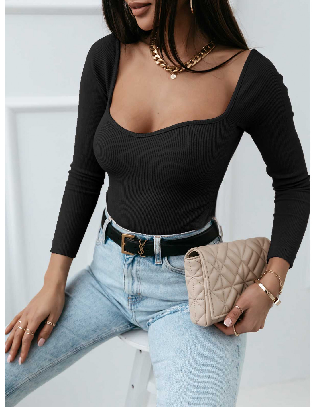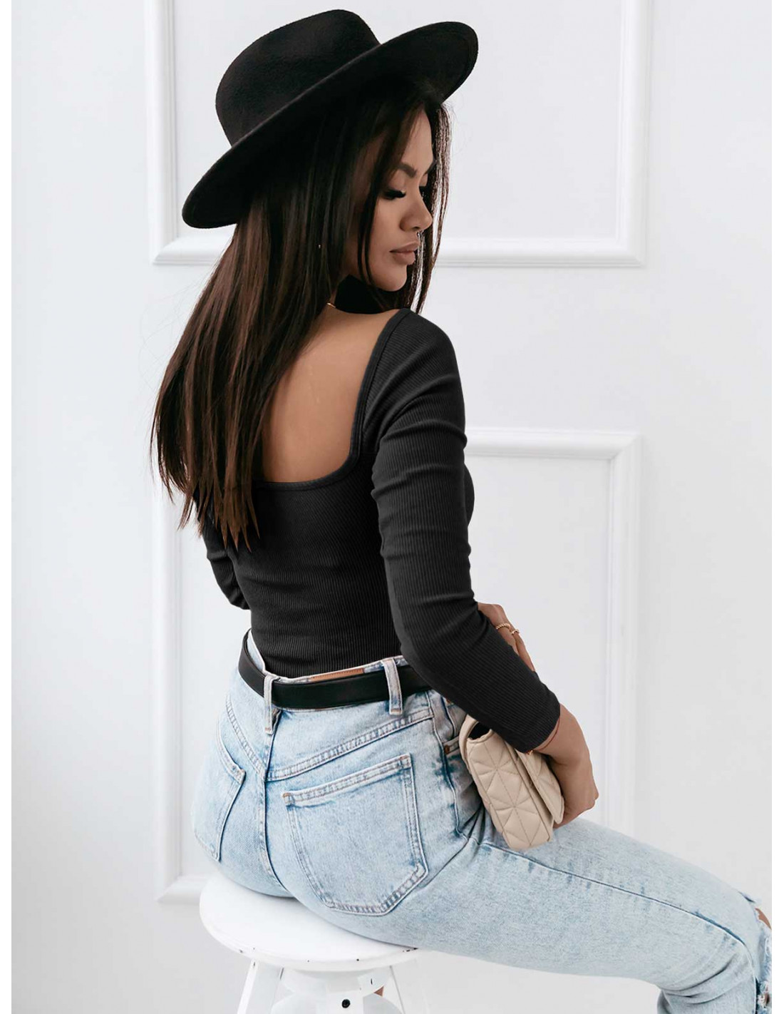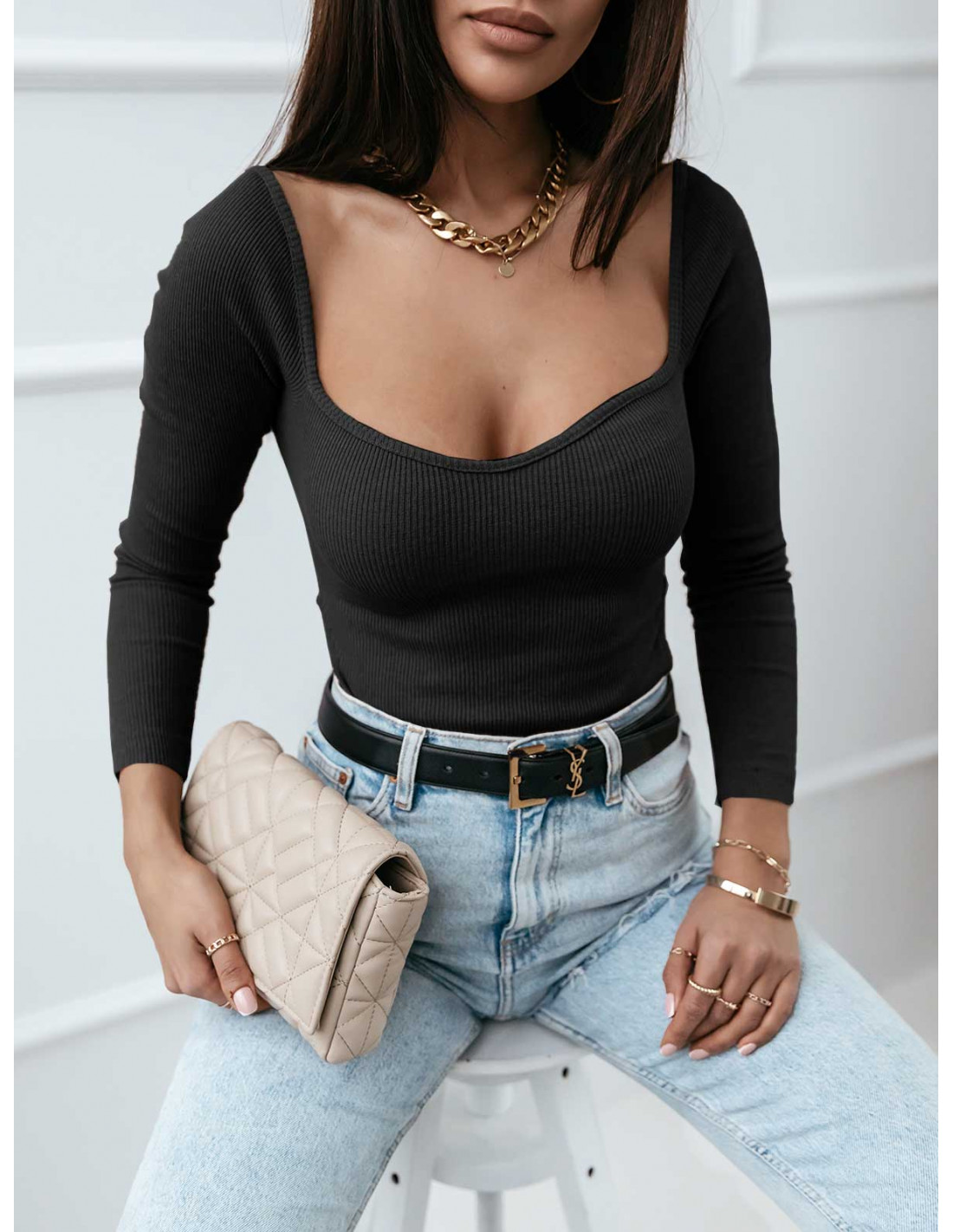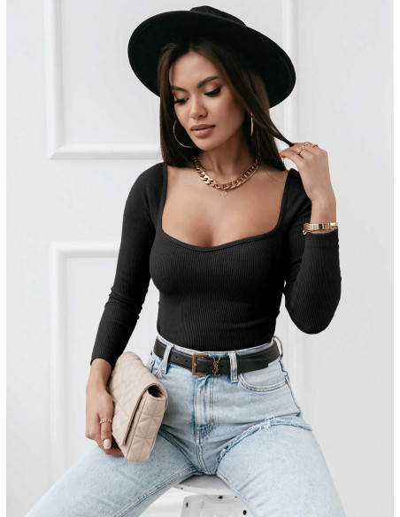 Prążkowana bluzka z głębokim dekoltem HAIDA - czarna