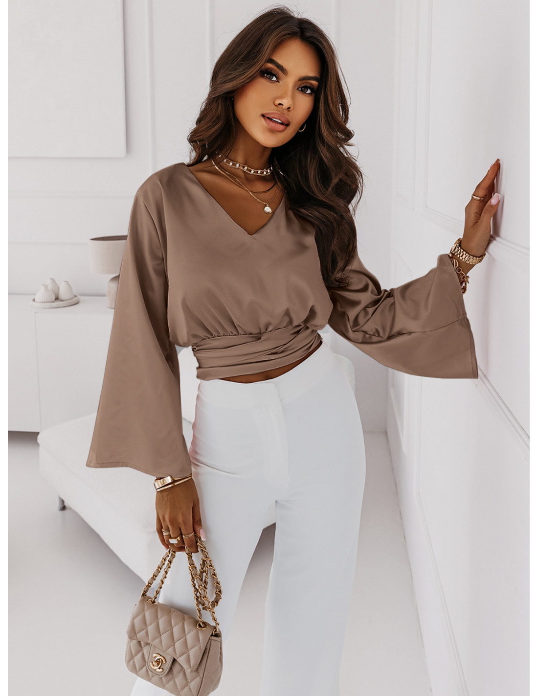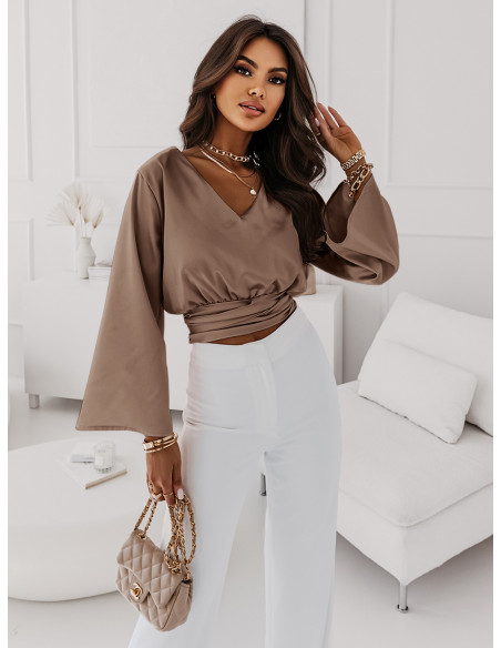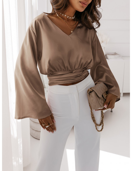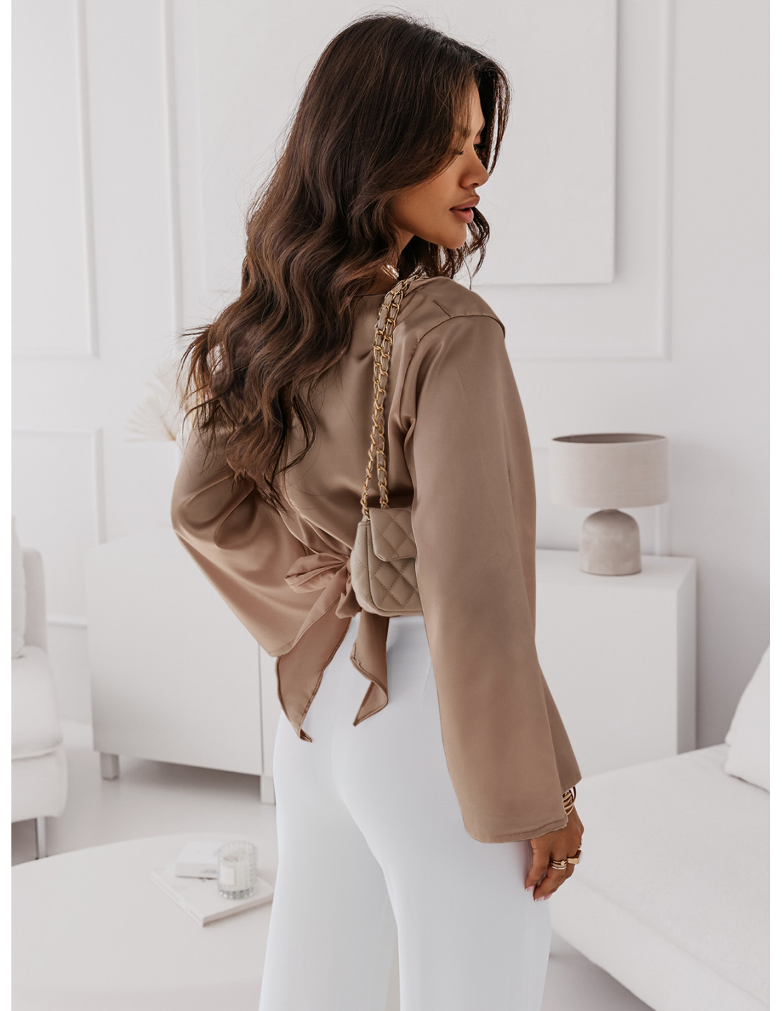 Satynowa bluzka z wiązaniem i szerokimi rękawami - ALZIRA - beżowa