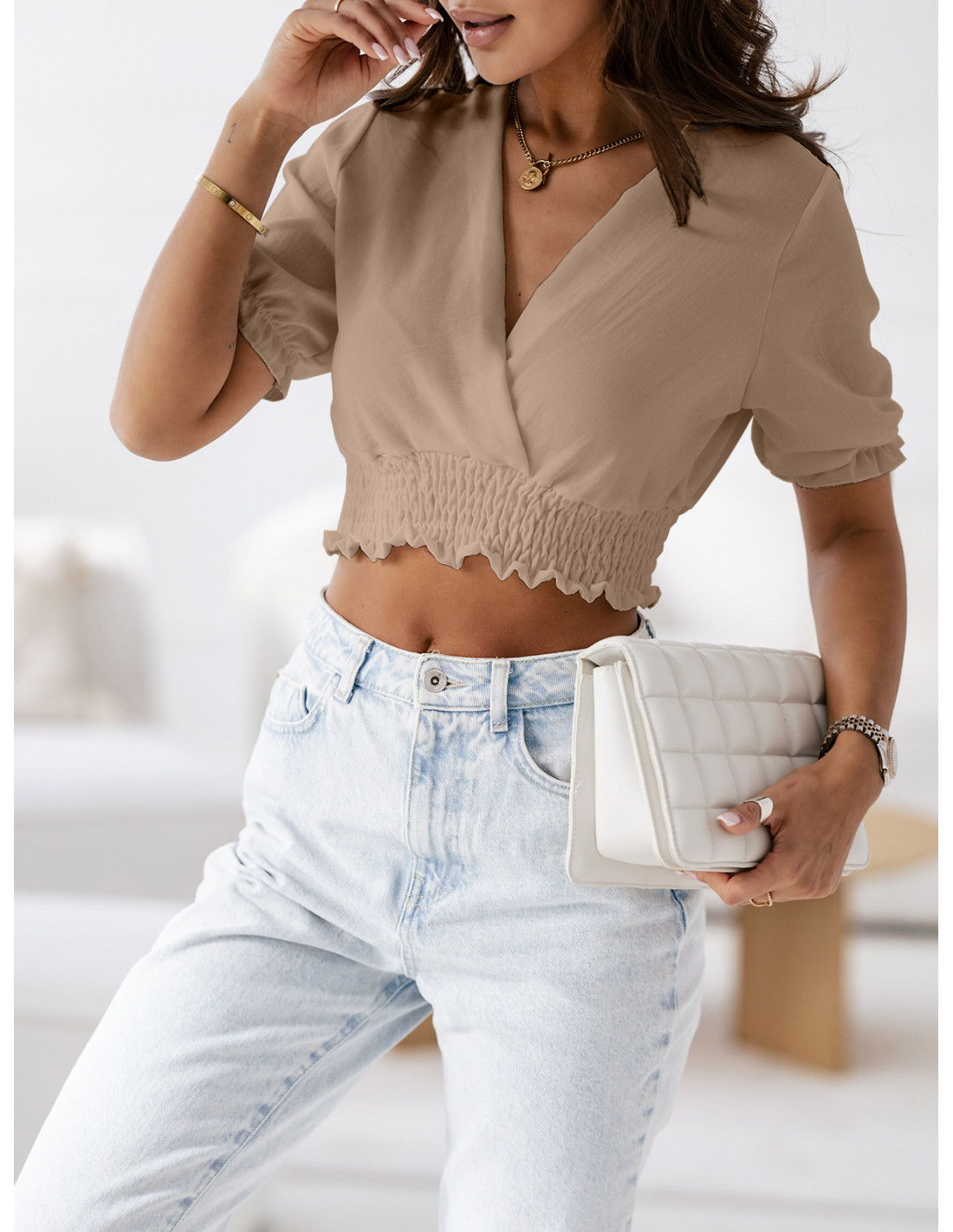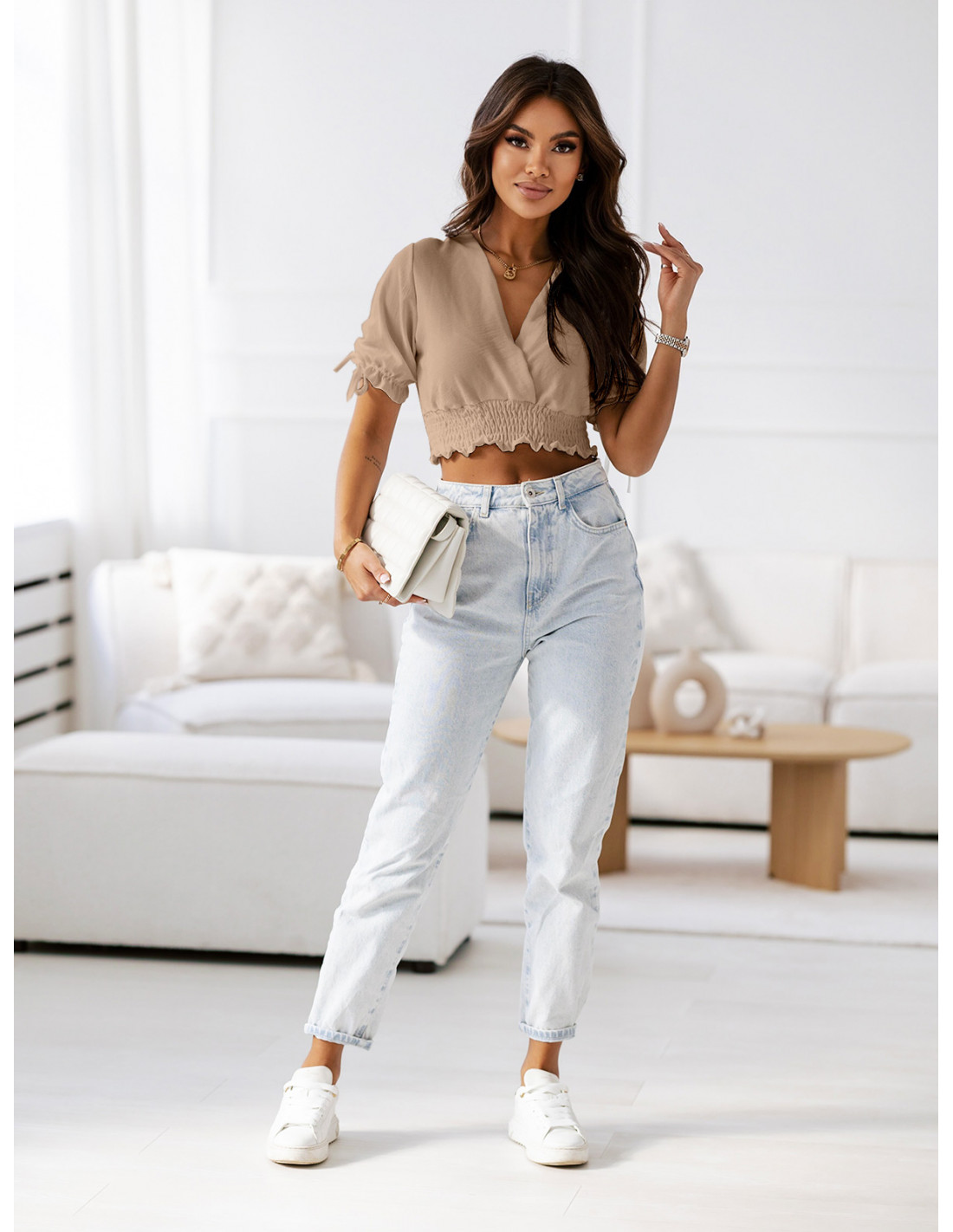 Bluzka crop top z przekładanym dekoltem - KASANDRA - beżowa