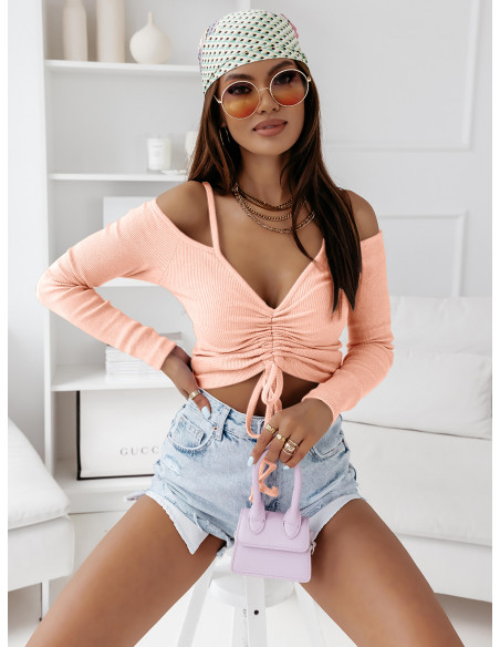Prążkowana bluzka z marszczeniem - VANILA - pudrowy róż