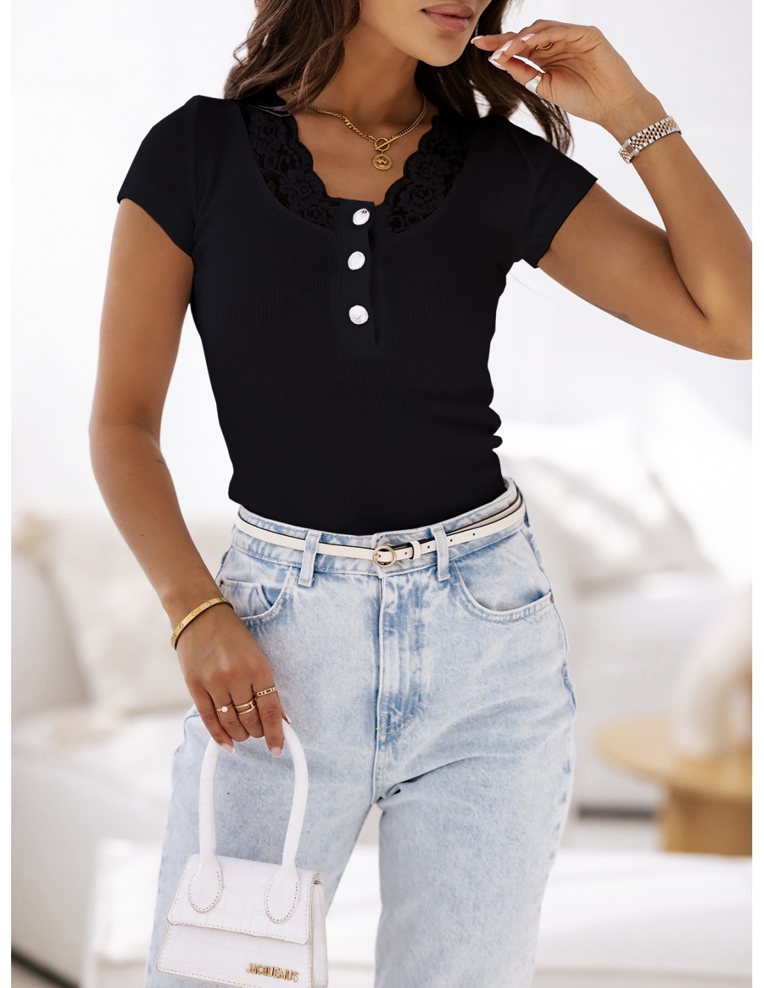Prążkowana bluzka z guzikami i koronką - BILIA - czarna