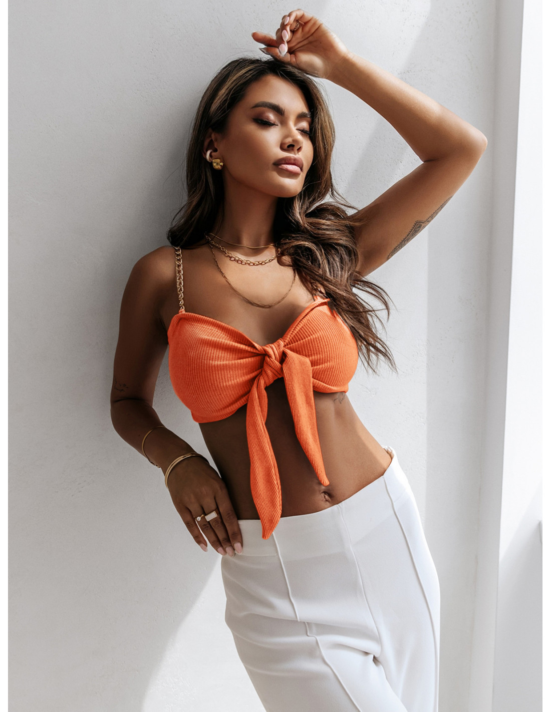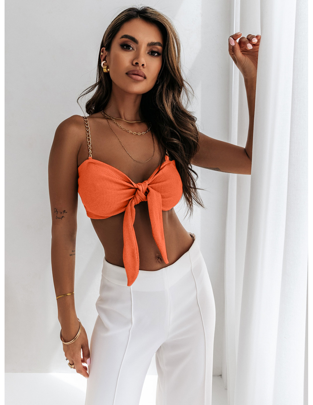 Bawełniana bluzka crop top wiązany ERICA - orange