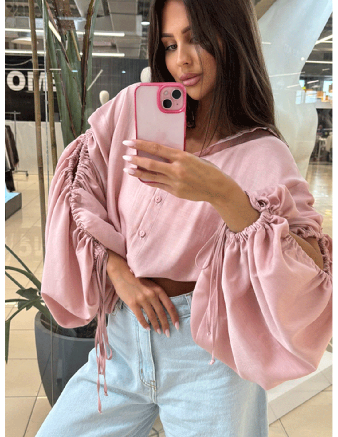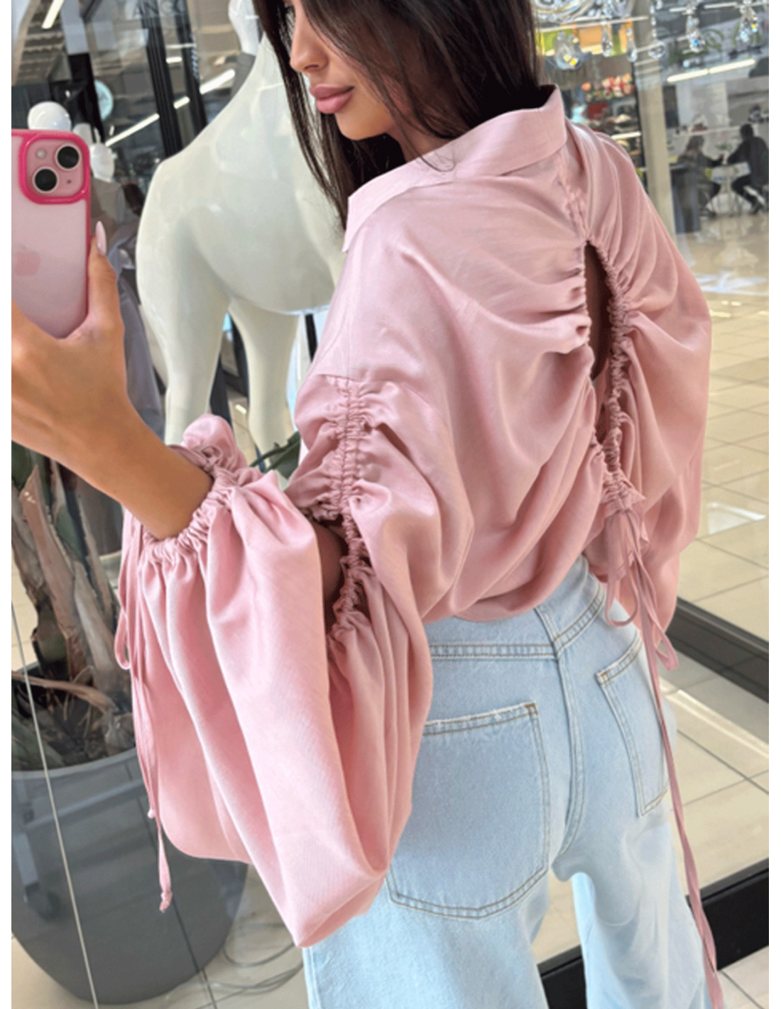 Wykonana z przyjemnej, oddychającej bawełny w odcieniu pudrowego różu, przyciąga uwagę ozdobnymi marszczeniami i wycięciami na rękawach oraz nietuzinkowym rozcięciem na plecach.