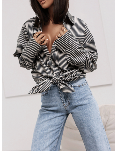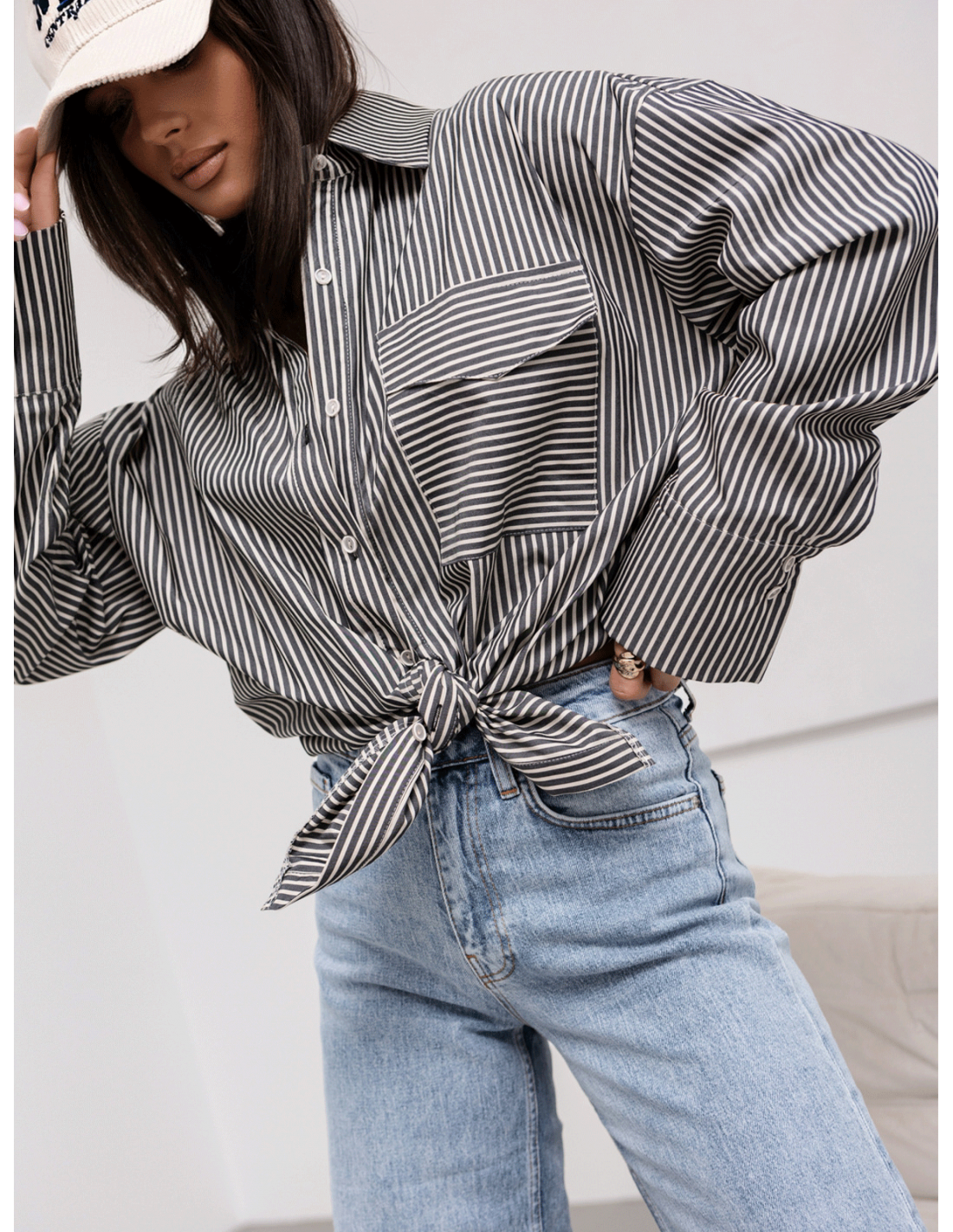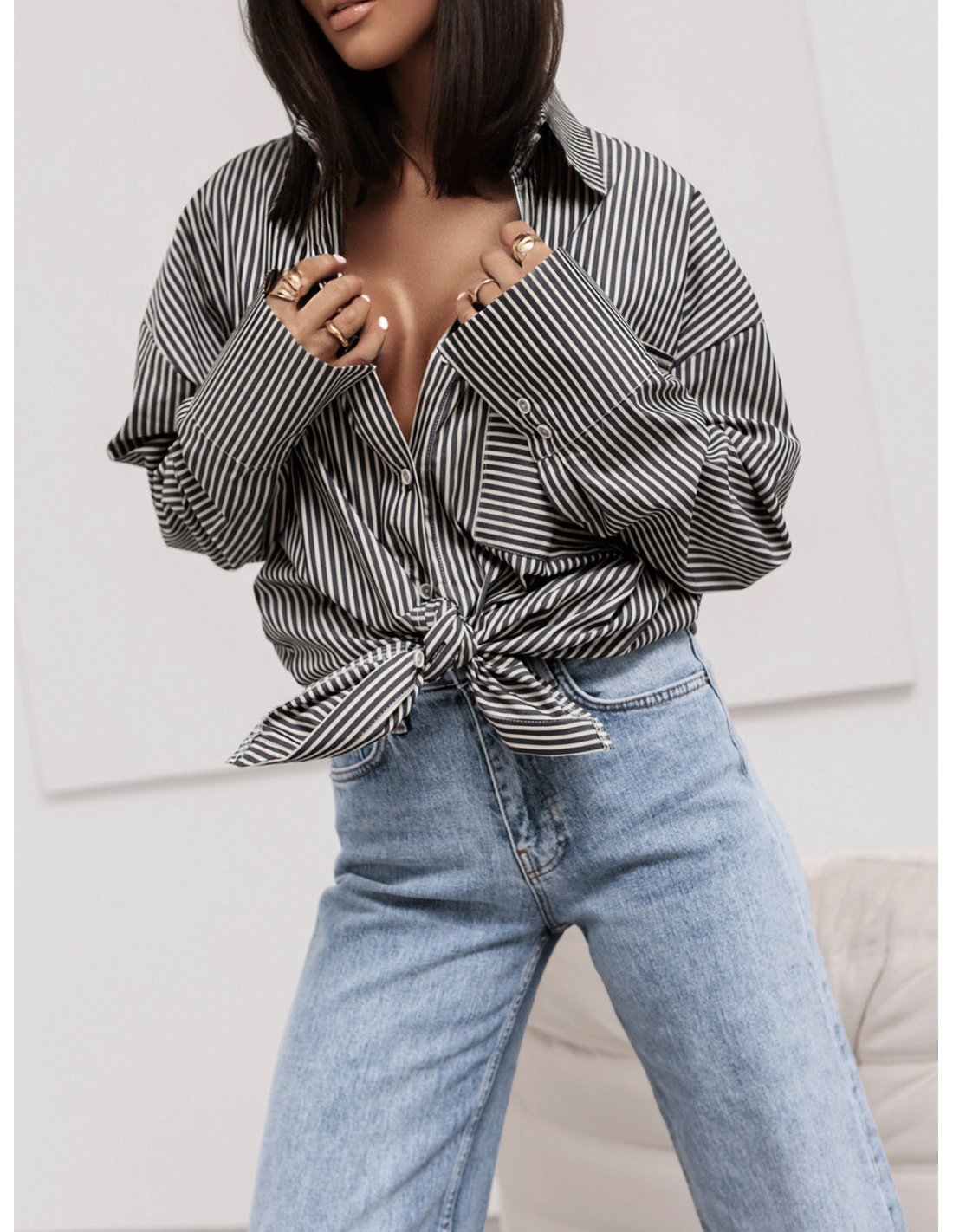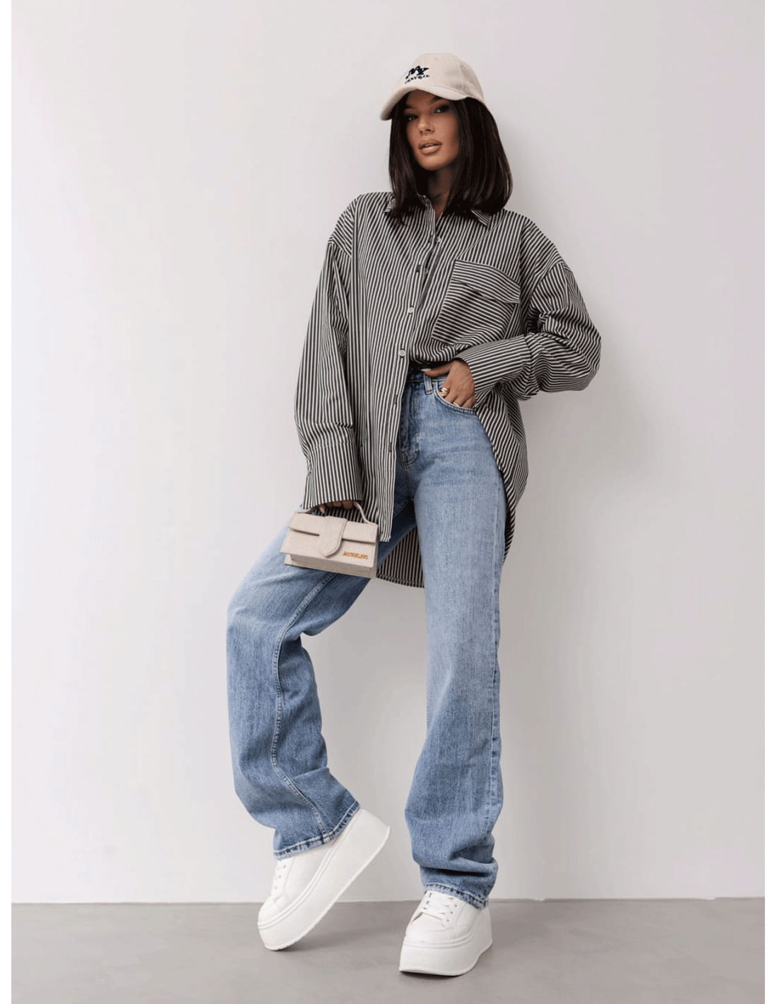 Noś ją luźno rozpiętą do topu i jeansów z wysokim stanem, zawiązaną w talii do szortów lub jako sukienkę oversize z paskiem i kozakami.