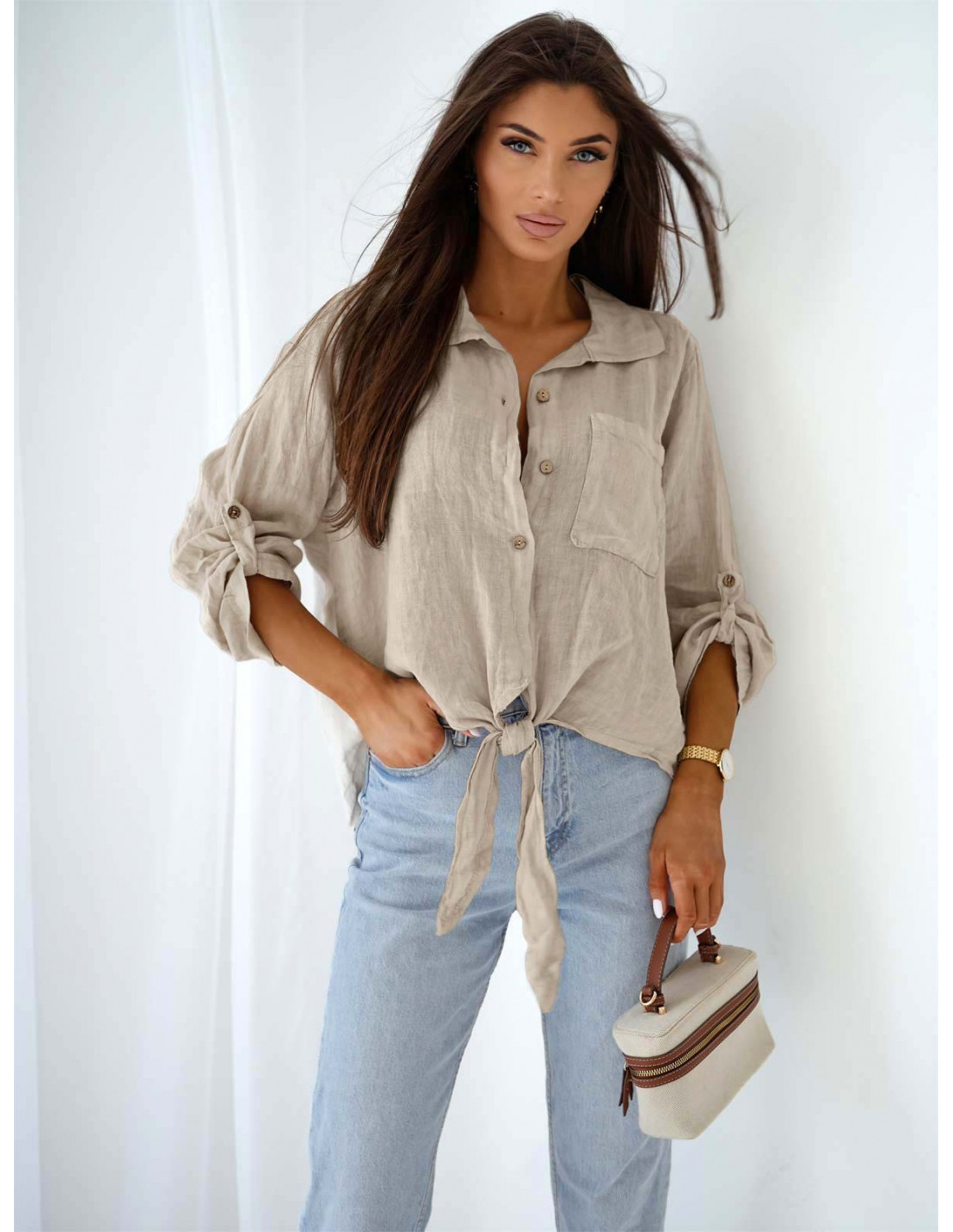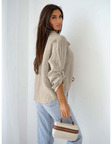 Lniana koszula oversize z wiązaniem DENI - beżowa