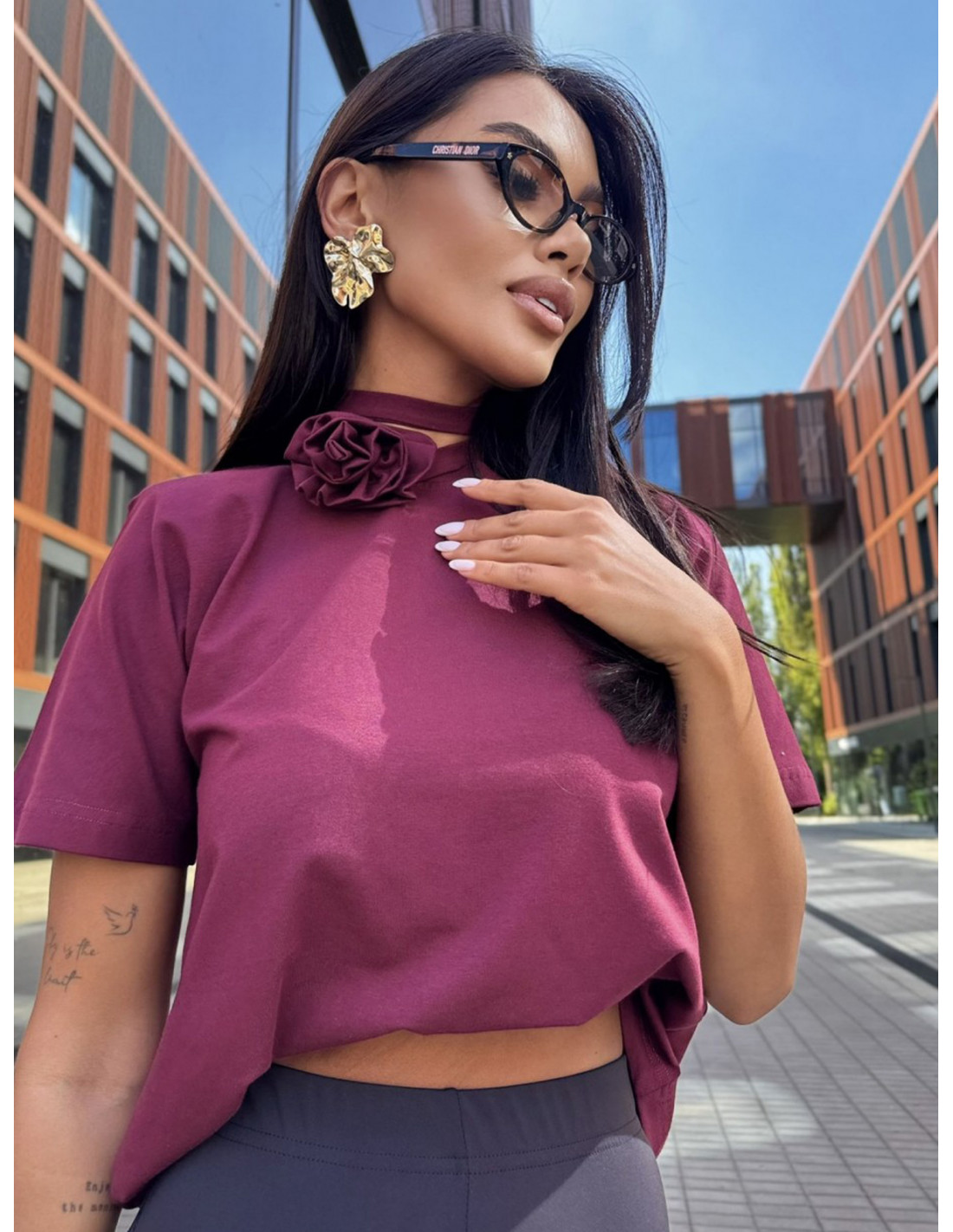 Bawełniana bluzka t-shirt z różą POLLIE - bordowa