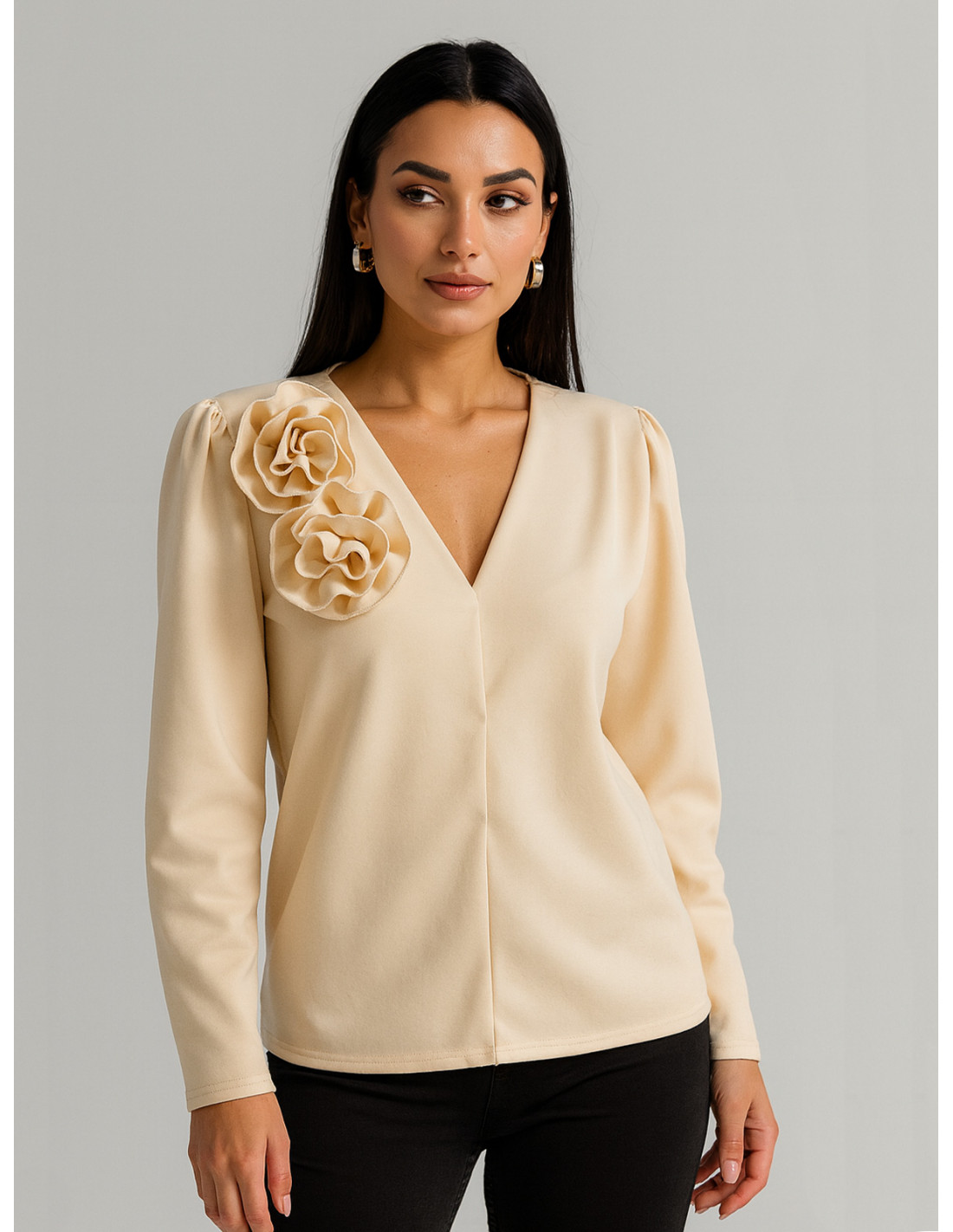 Elegancka bluzka z ozdobnymi różami w kolorze beżowym.