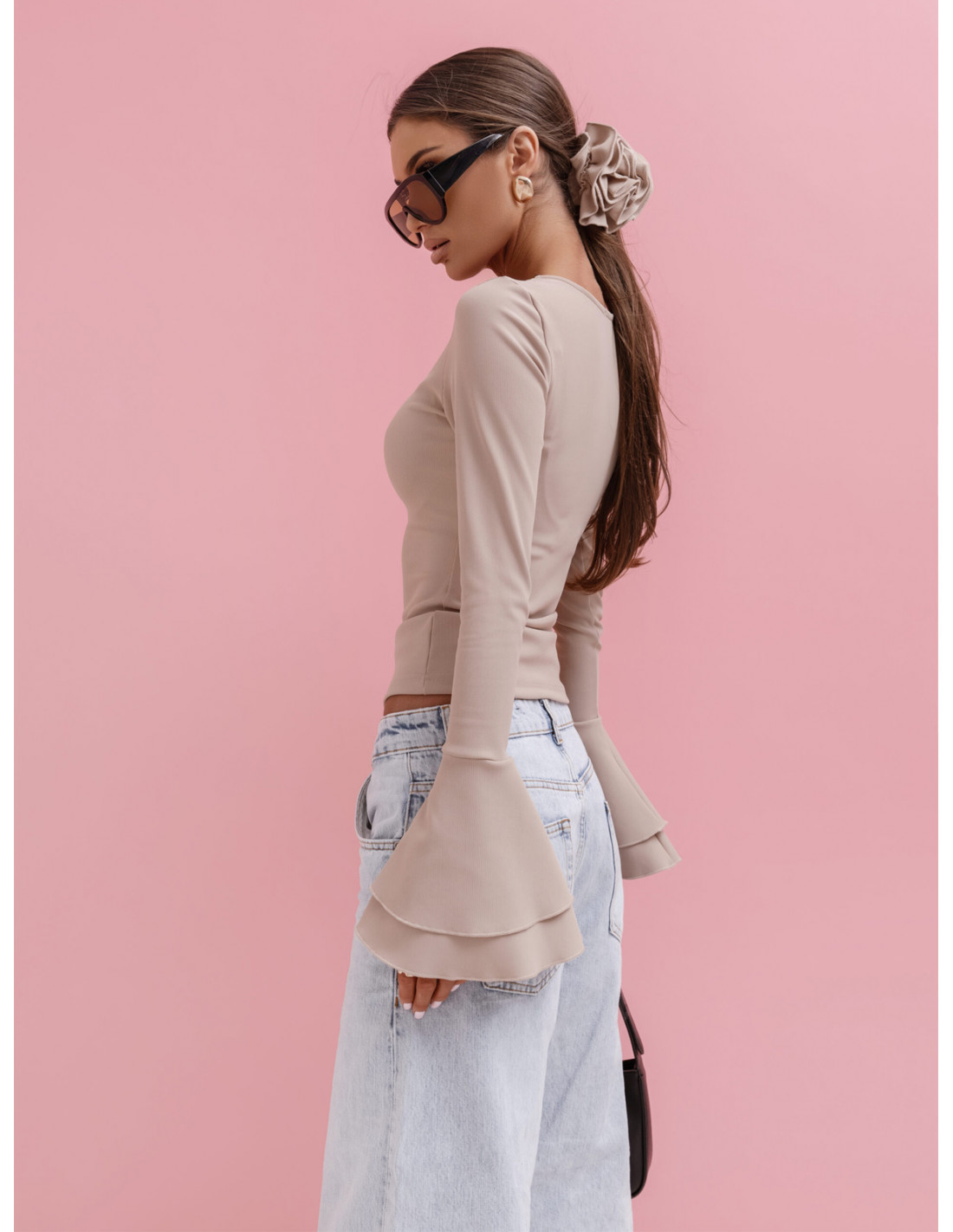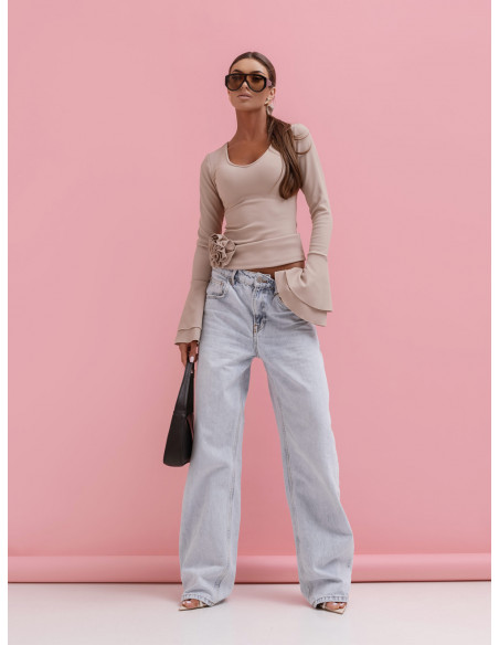 Prążkowana bluzka z falbanami na rękawach AVELLINA - beżowa