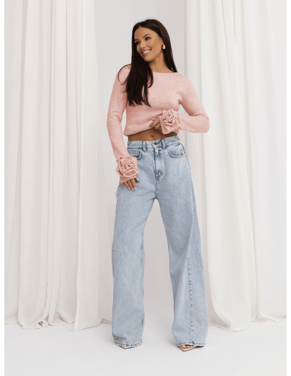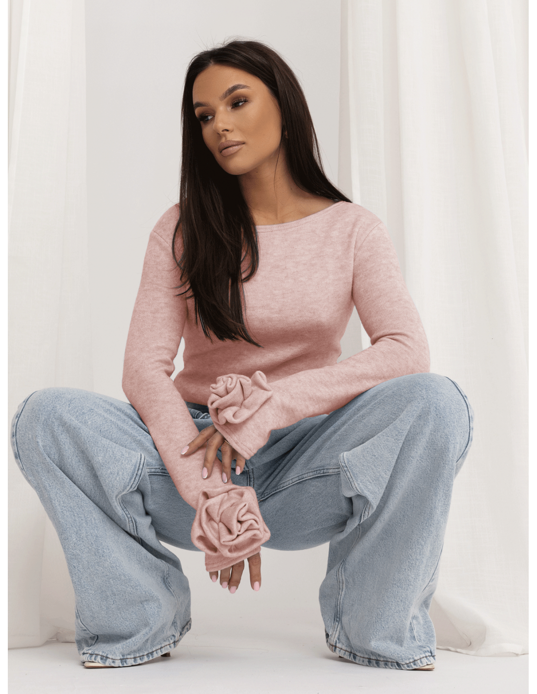 Dzianinowa bluzka z różą na rękawie DELFINA - pudrowy róż