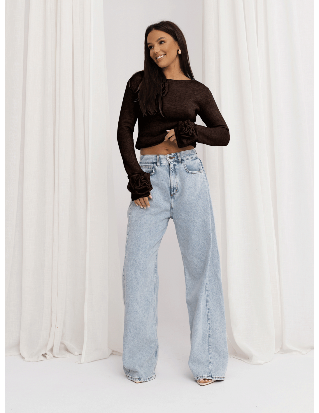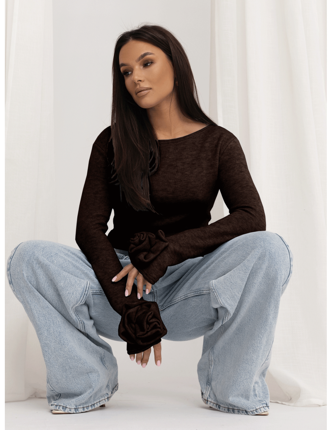 Dzianinowa bluzka z różą na rękawie DELFINA - czekoladowa