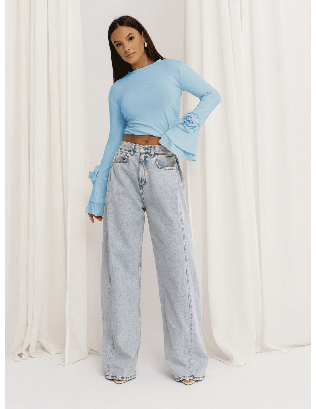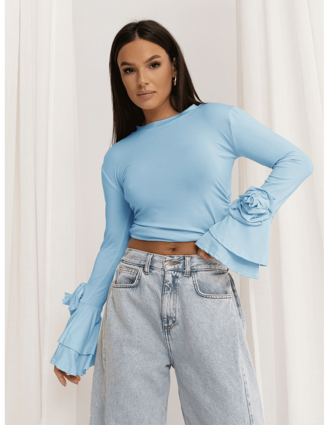 Szerokie, efektownie rozkloszowane rękawy przyciągają uwagę, a ozdobne róże umieszczone po bokach dodają całości romantycznego, wyjątkowego charakteru.