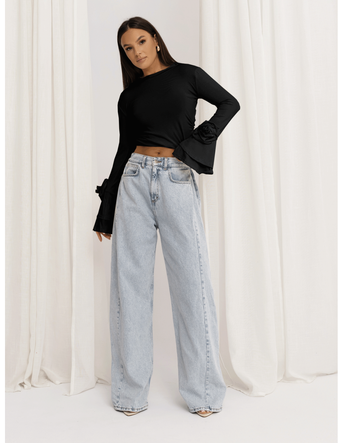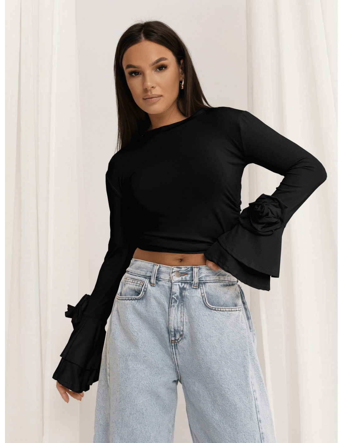 Szerokie, efektownie rozkloszowane rękawy przyciągają uwagę, a ozdobne róże umieszczone po bokach dodają całości romantycznego, wyjątkowego charakteru.