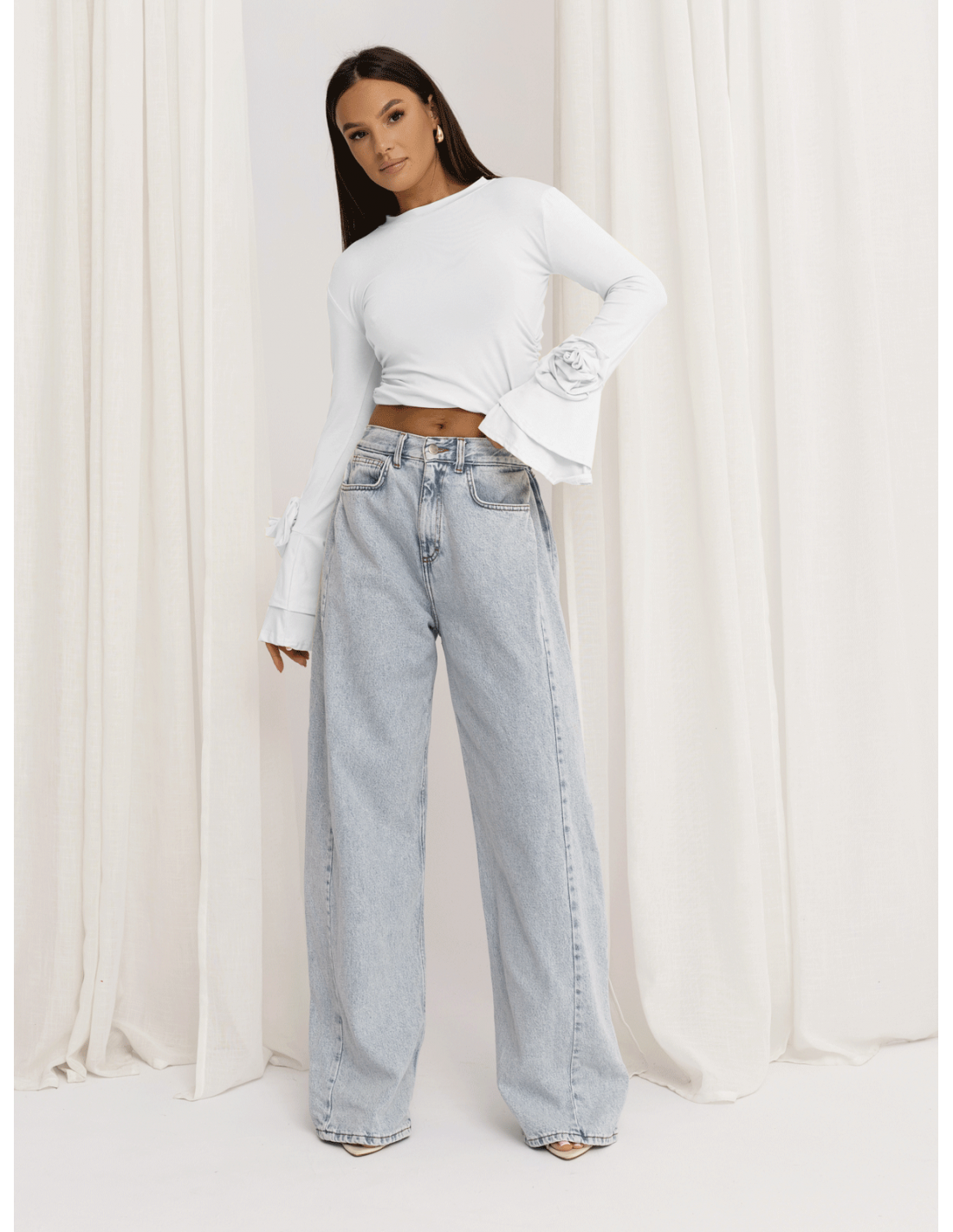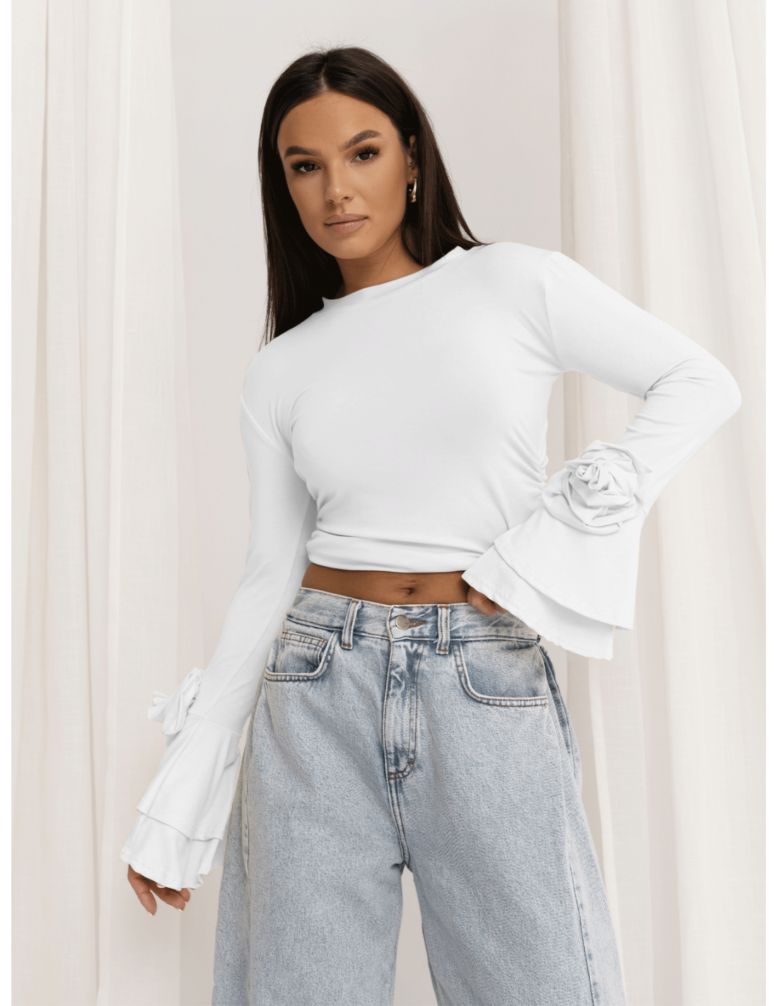 Szerokie, efektownie rozkloszowane rękawy przyciągają uwagę, a ozdobne róże umieszczone po bokach dodają całości romantycznego, wyjątkowego charakteru.