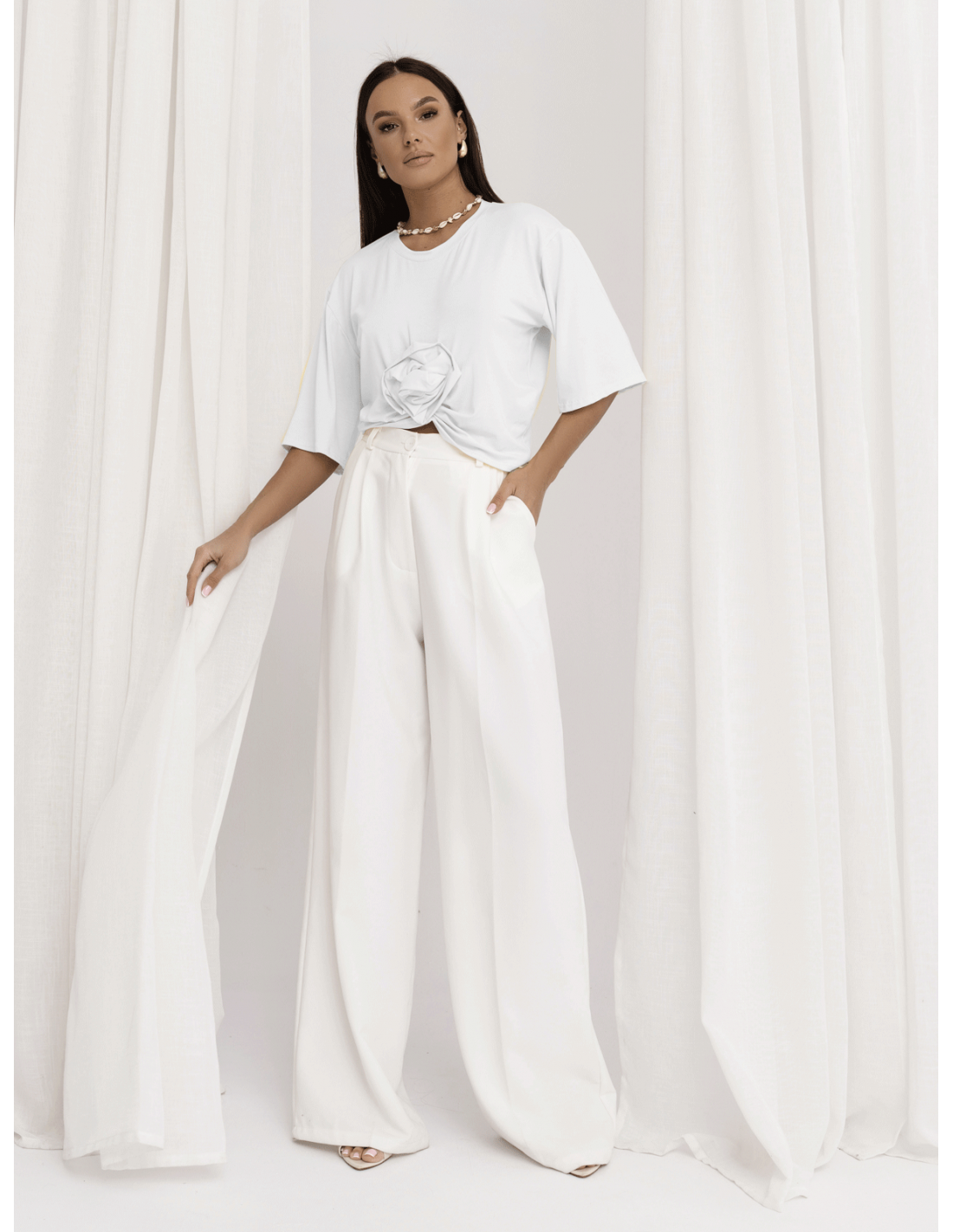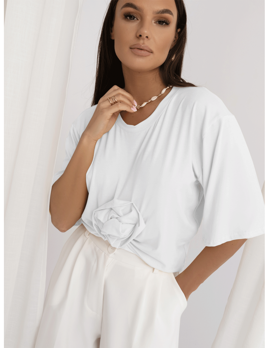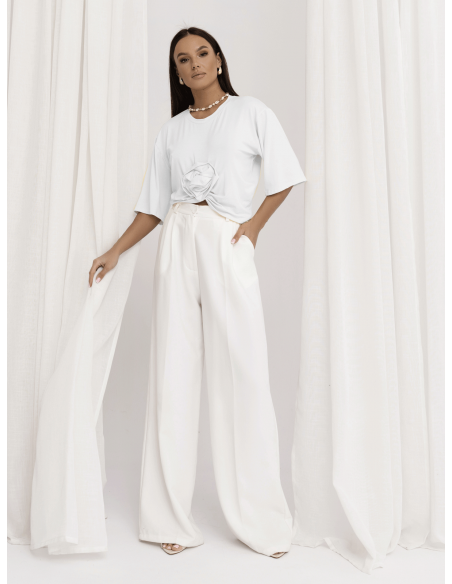 Klasyczny fason t-shirtu zyskuje wyjątkowy charakter dzięki efektownej, przestrzennej róży, która nadaje stylizacji modowego wyrazu.