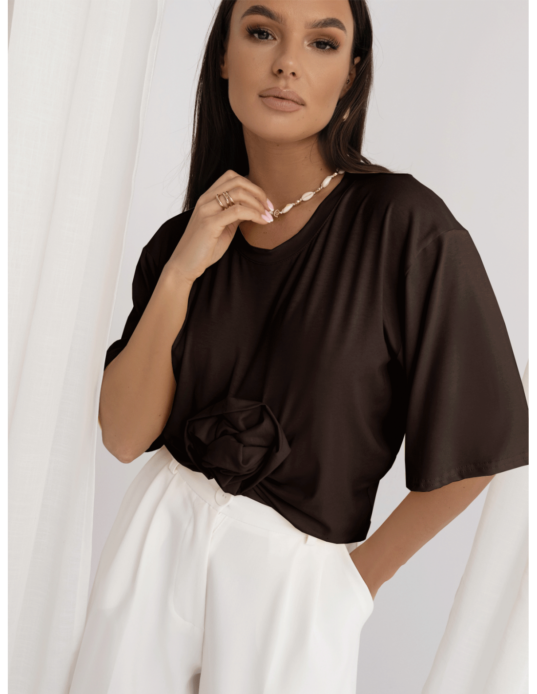 Wiskozowy t-shirt z ozdobną róża CRESSIDA - czekoladowy