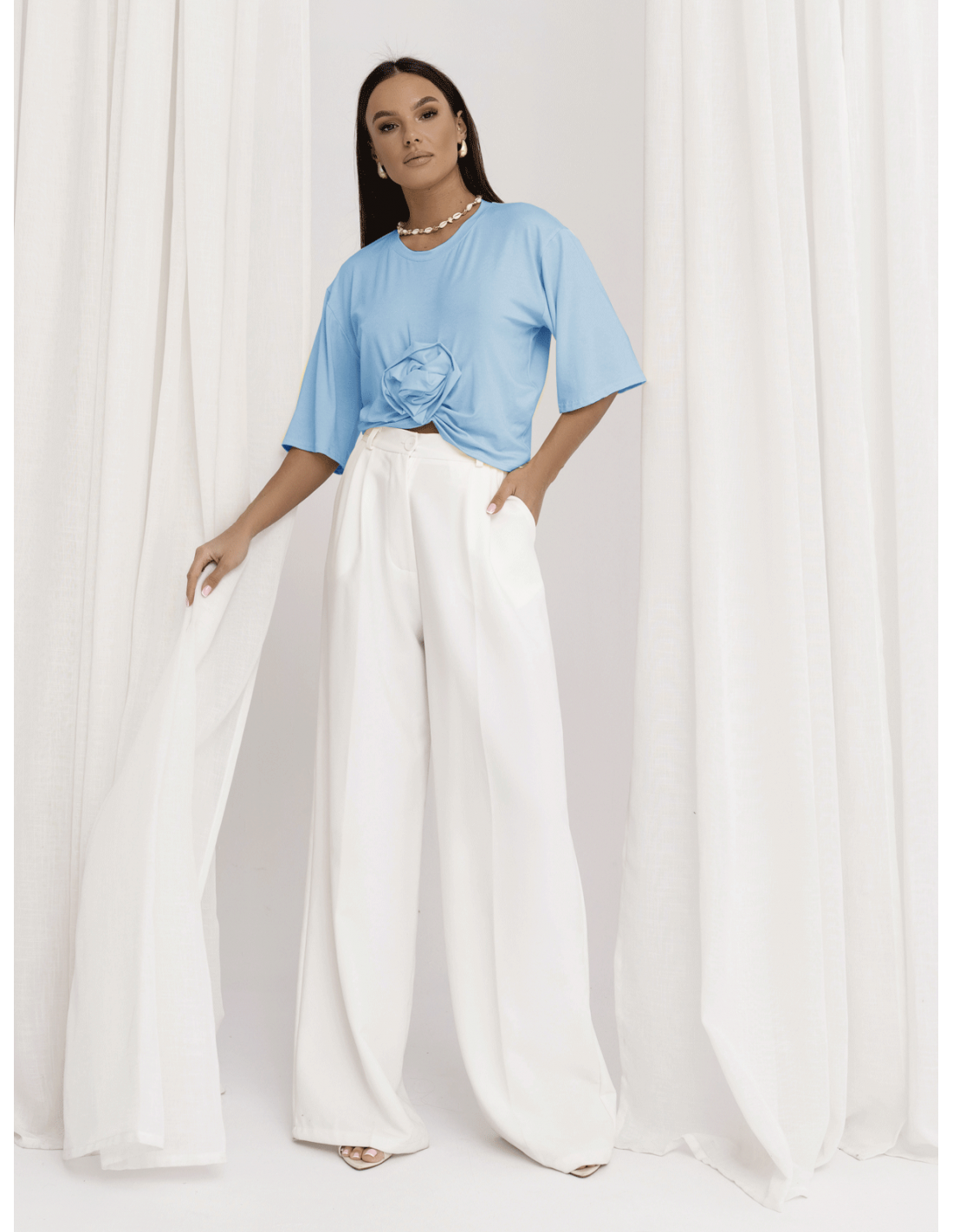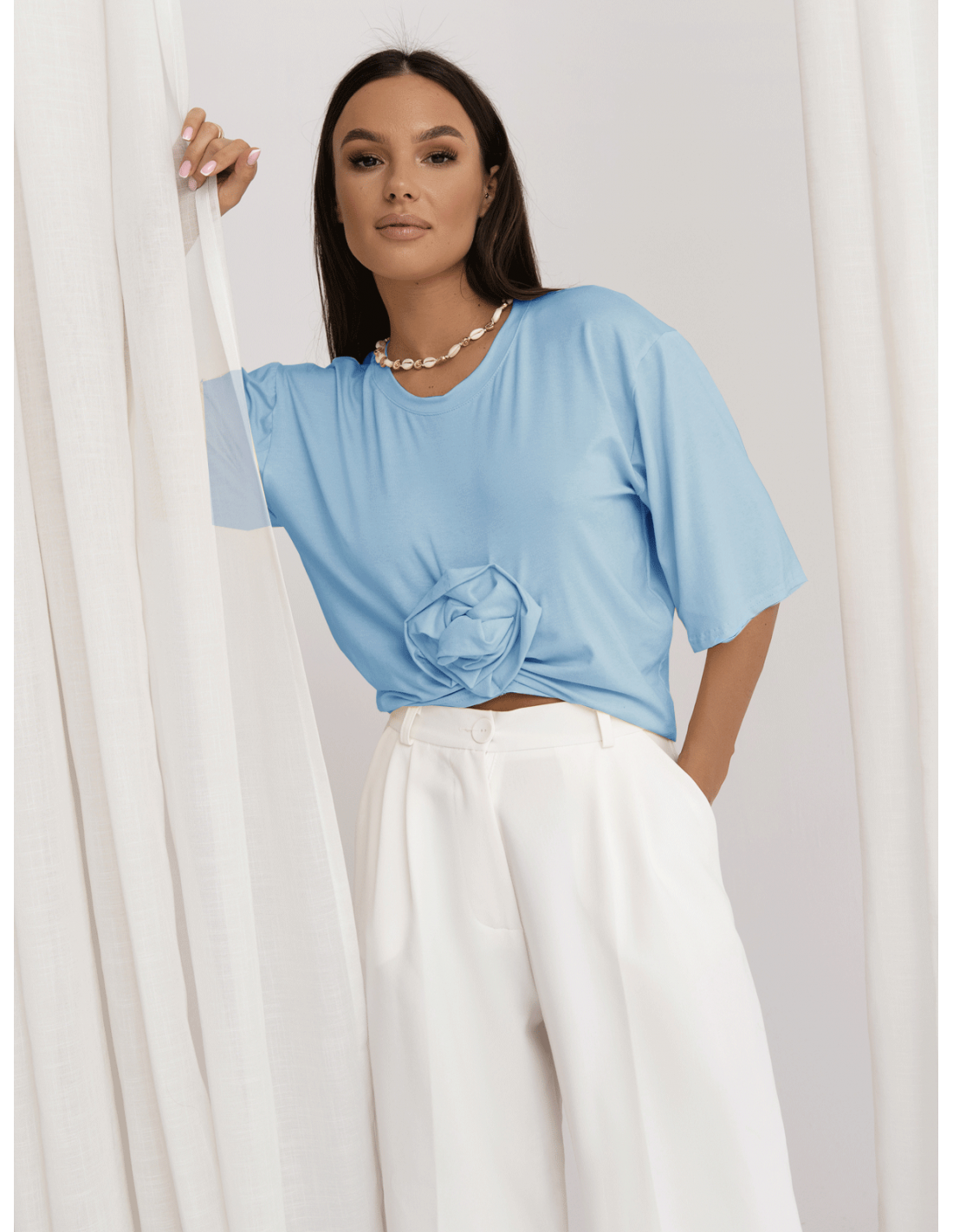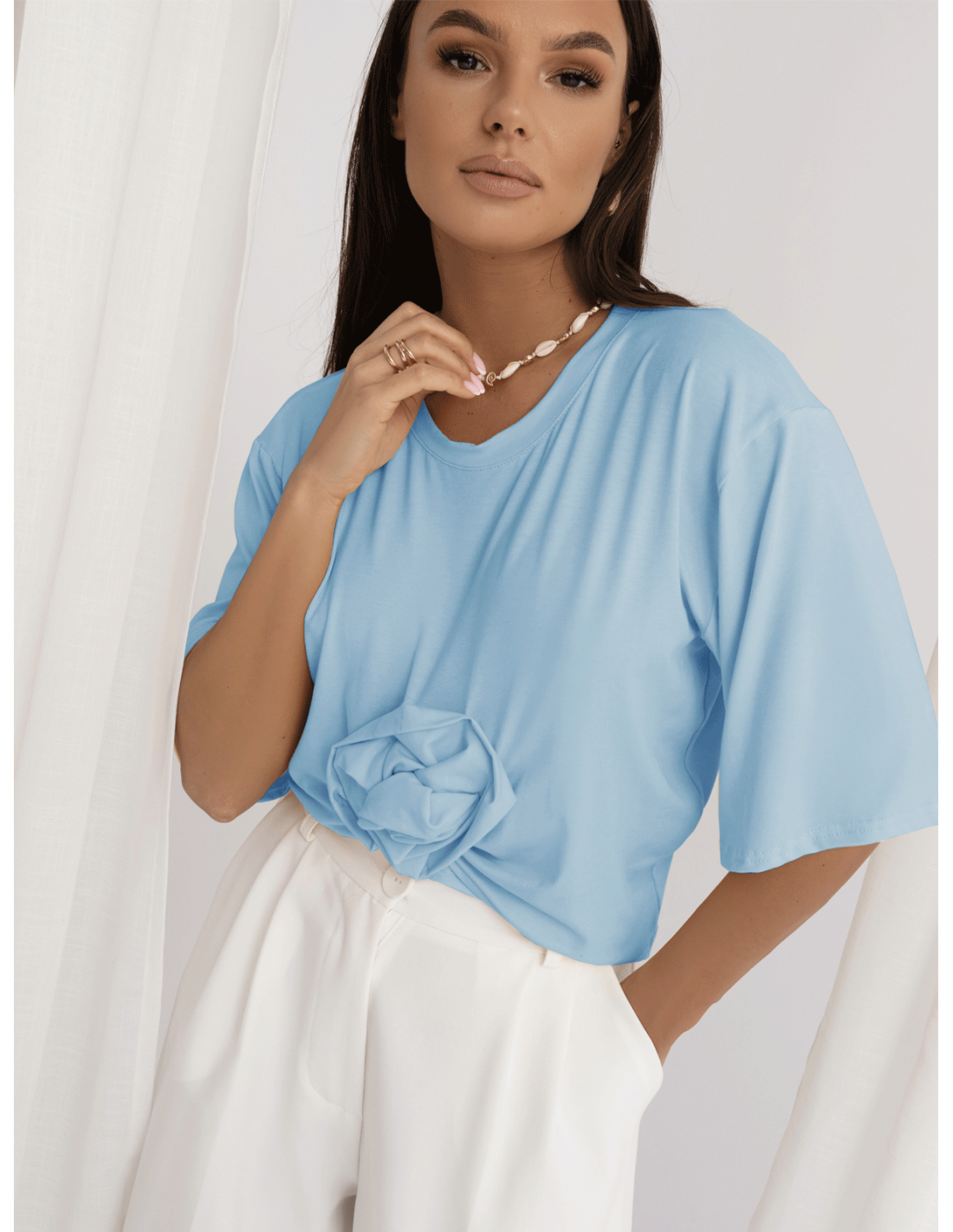 Wiskozowy t-shirt z ozdobną róża CRESSIDA - błękitna
