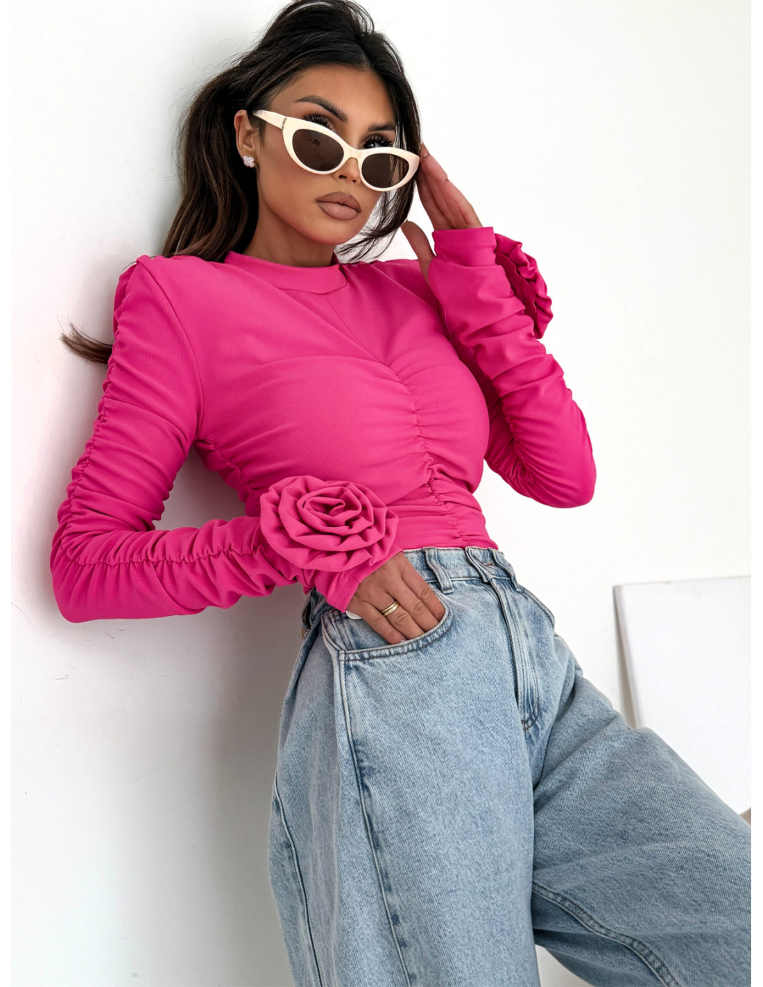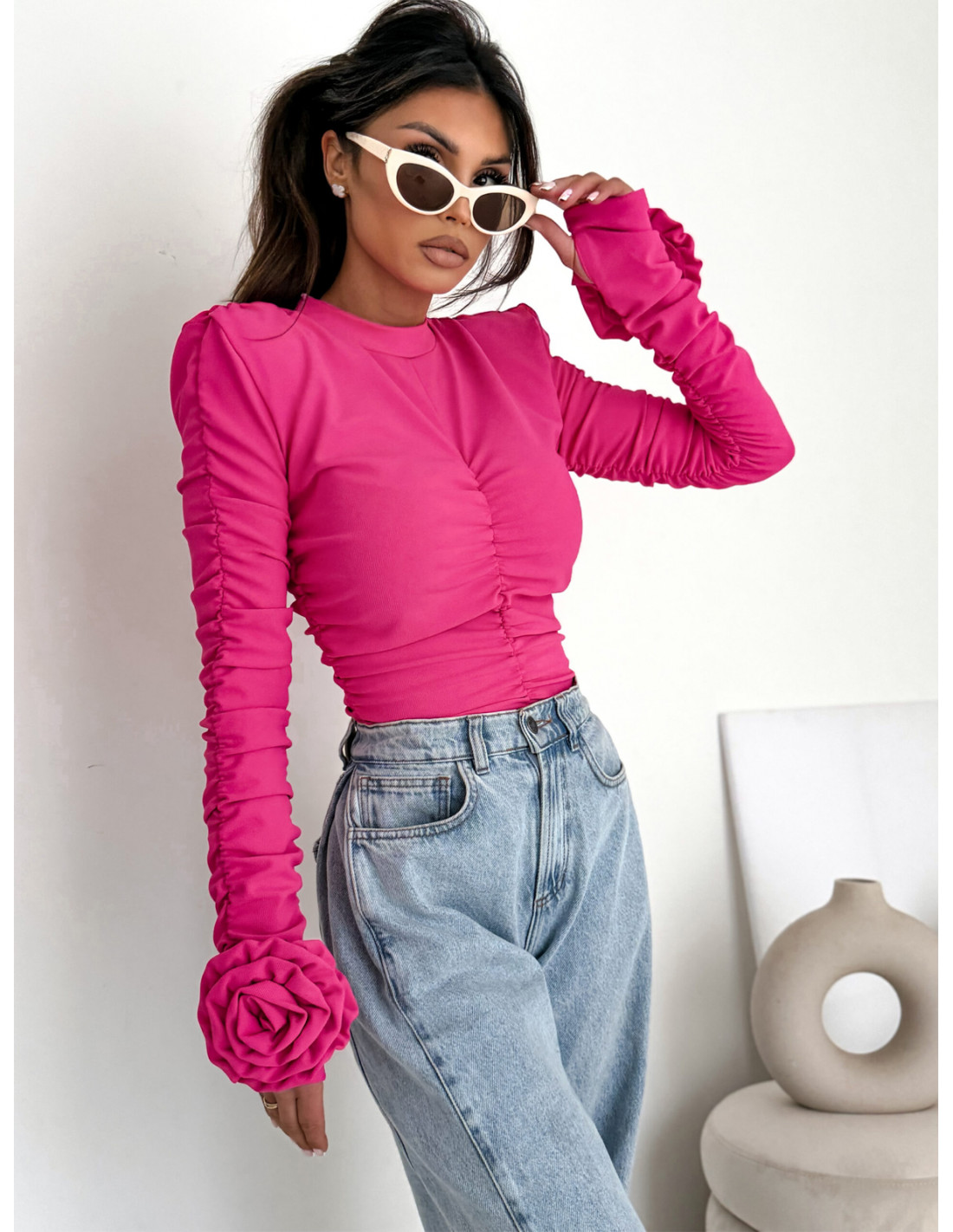 Efektowne marszczone rękawy dodają całości wyrazistości, a dopinane ozdobne kwiaty przyciągają spojrzenia i nadają bluzce luksusowego akcentu.