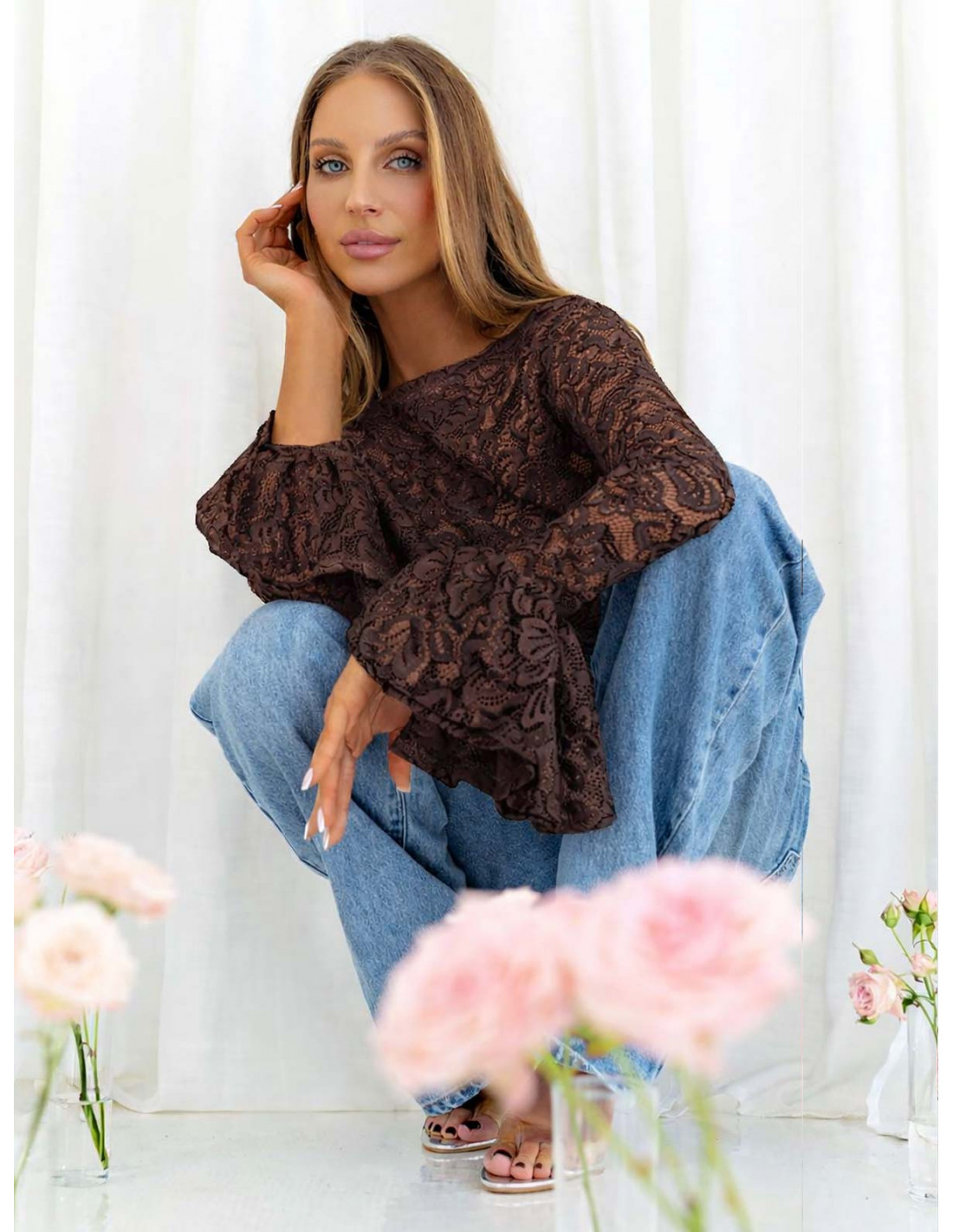 Koronkowa bluzka z falbanami na rękawach ITANJA - czekoladowa