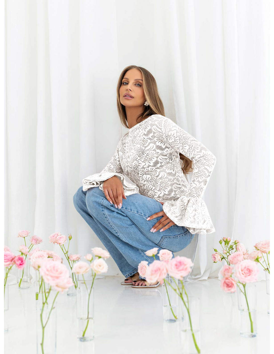 Koronkowa bluzka z falbanami na rękawach ITANJA - biała