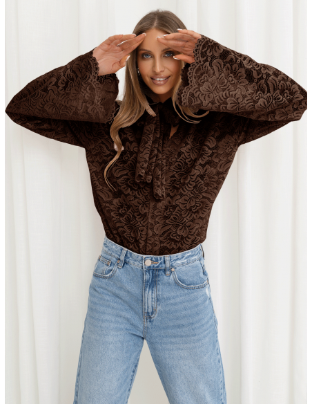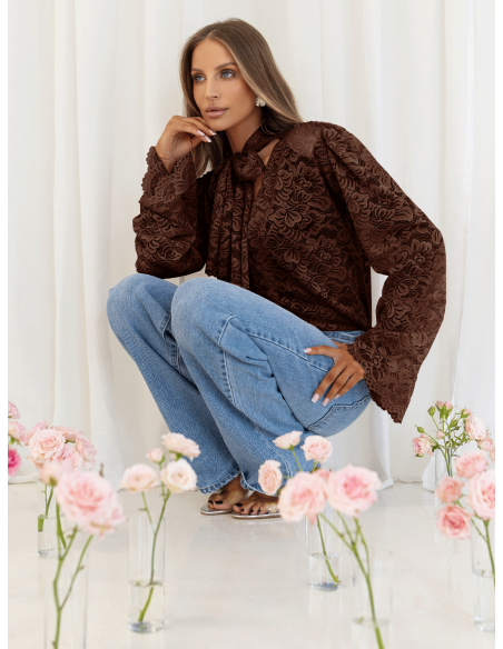 Koronkowa bluzka z ozdobnym wiązaniem MISTY - czekoladowa