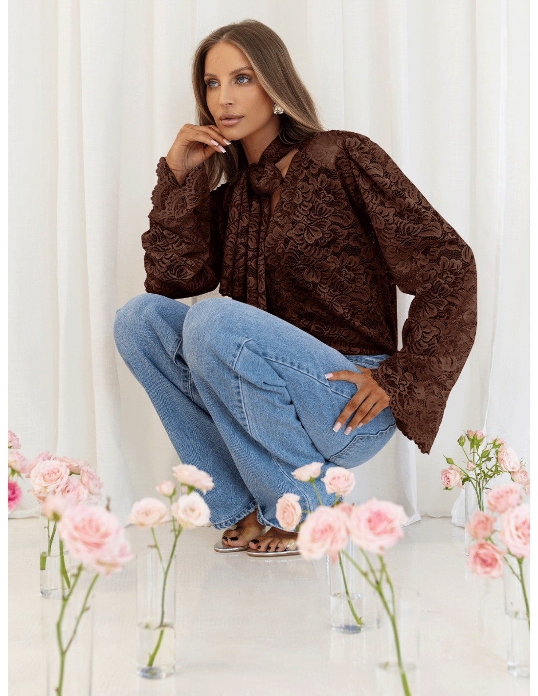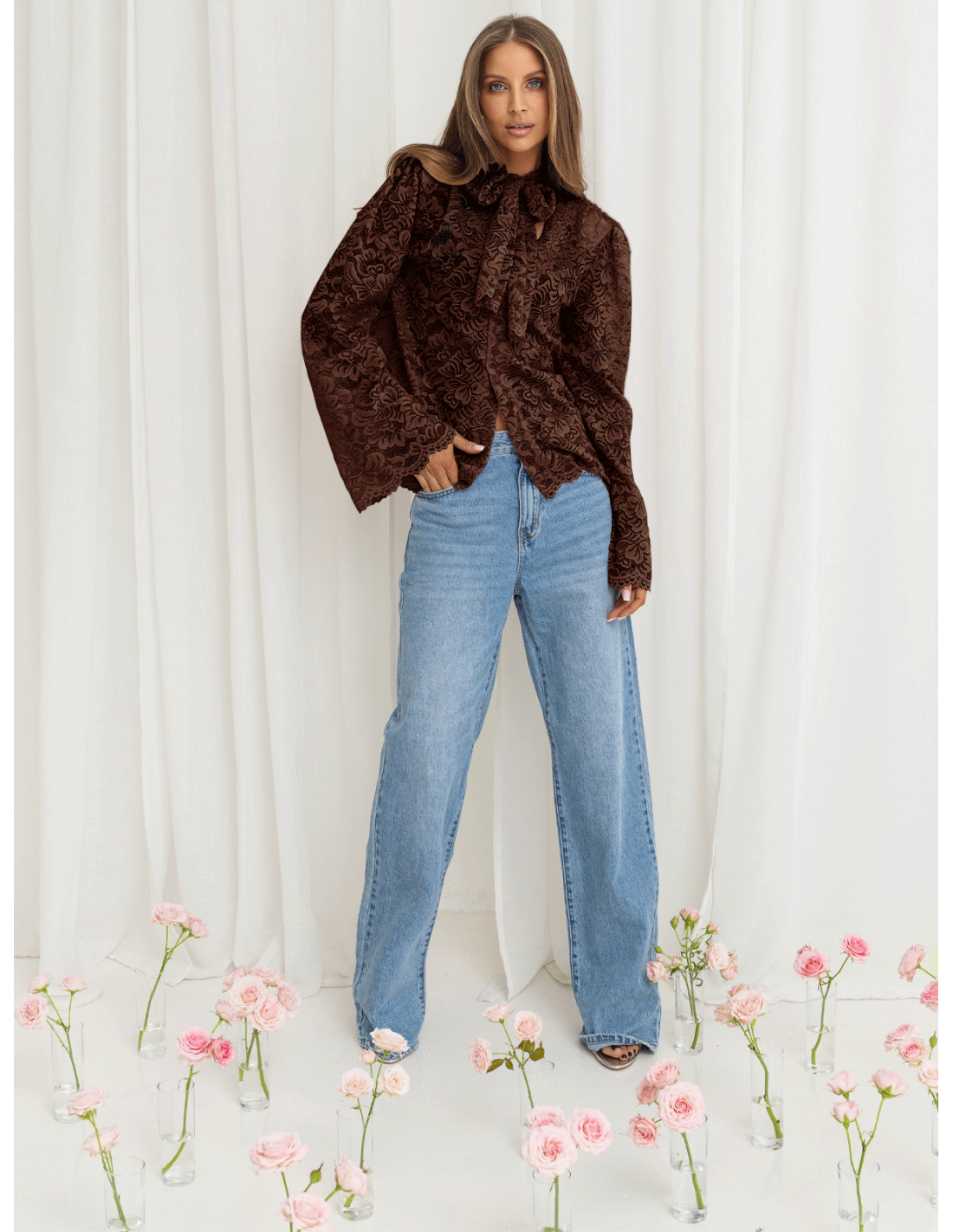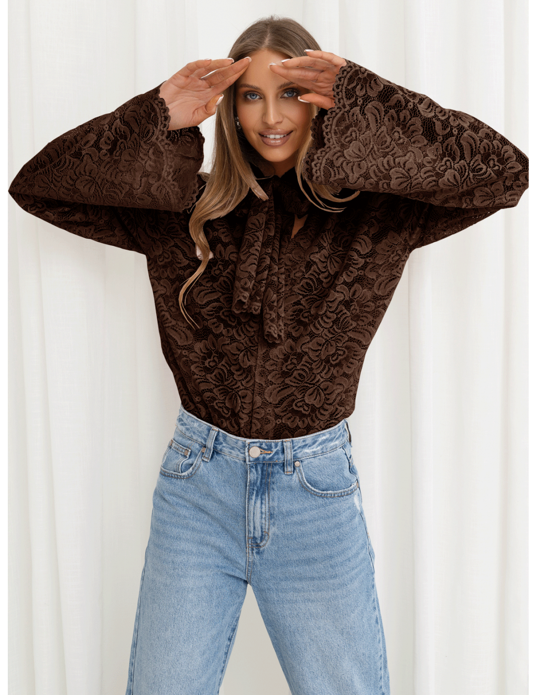 Koronkowa bluzka z ozdobnym wiązaniem w kolorze czekoladowym podkreśla styl i ponadczasową klasę.