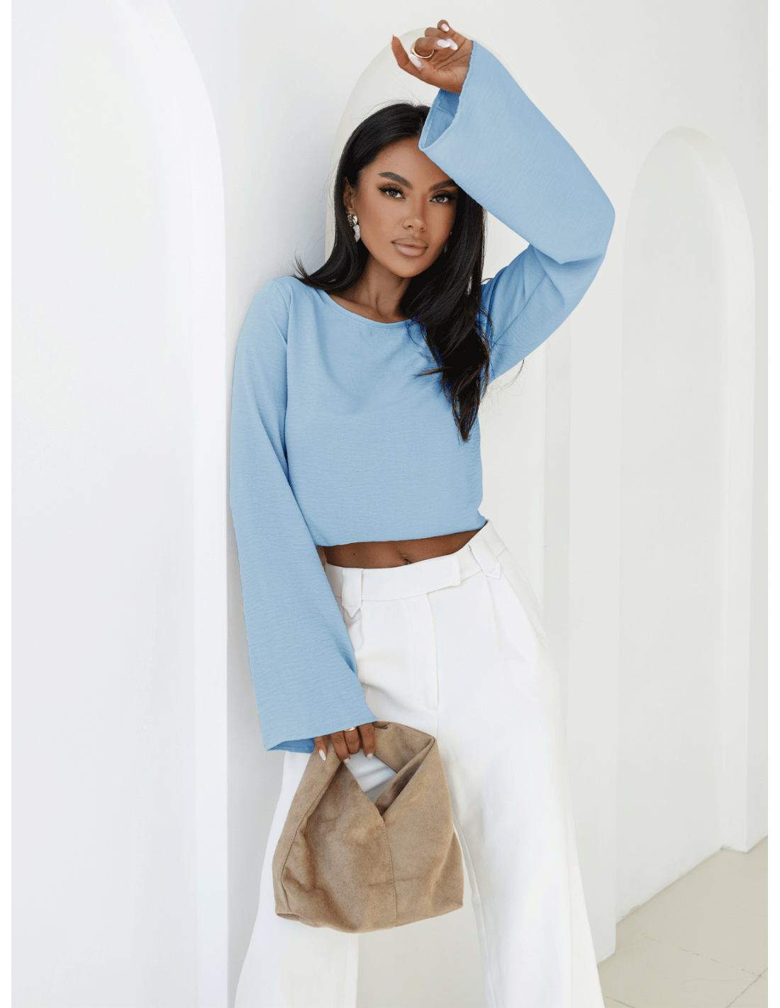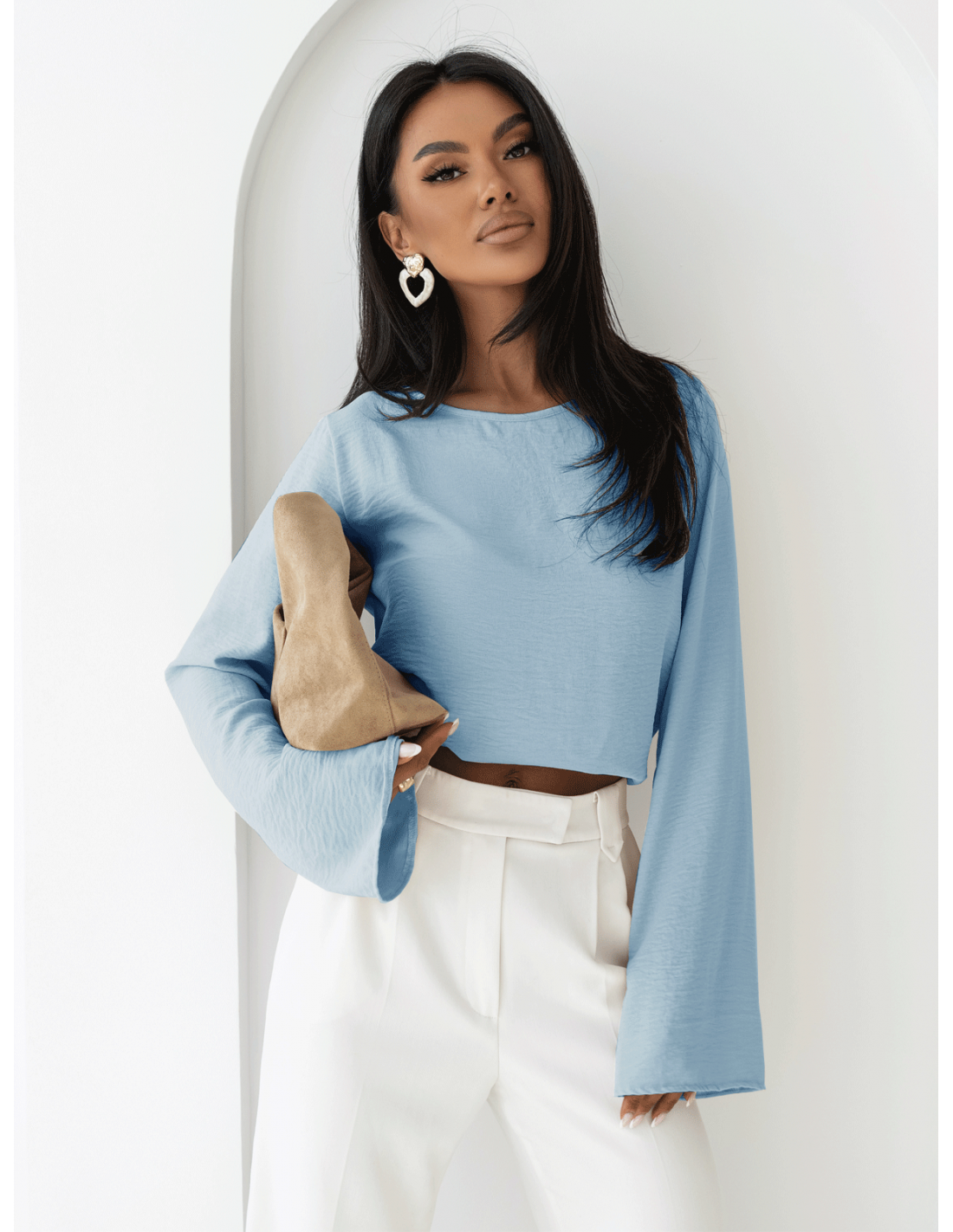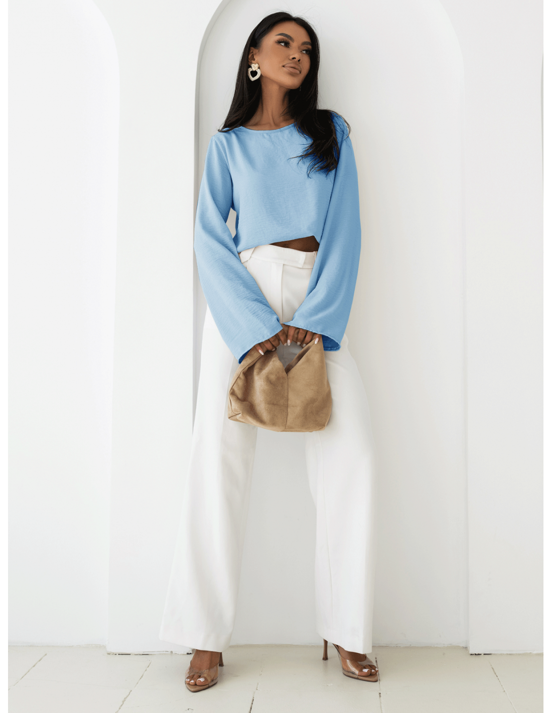 Bluzka z szerokimi rękawami w kolorze błękitnym idealne uzupełnienie do wiosenno-letnich stylizacji.