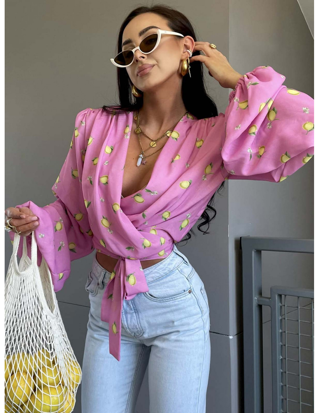 Bluzka wiązana z przekładanym dekoltem LEMON - różowa