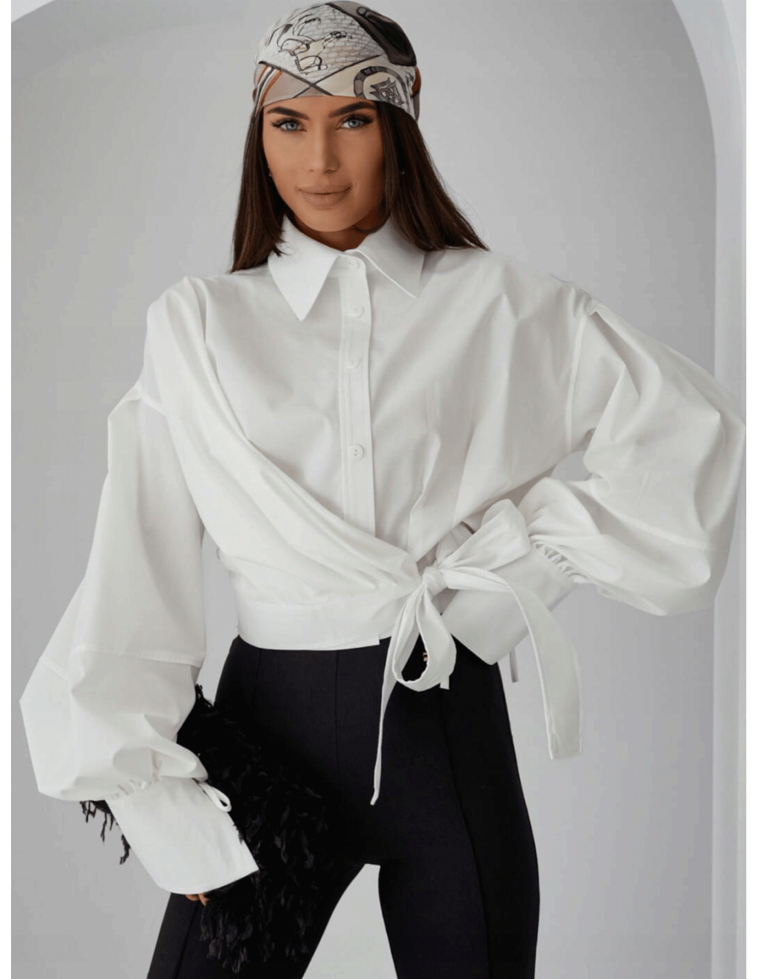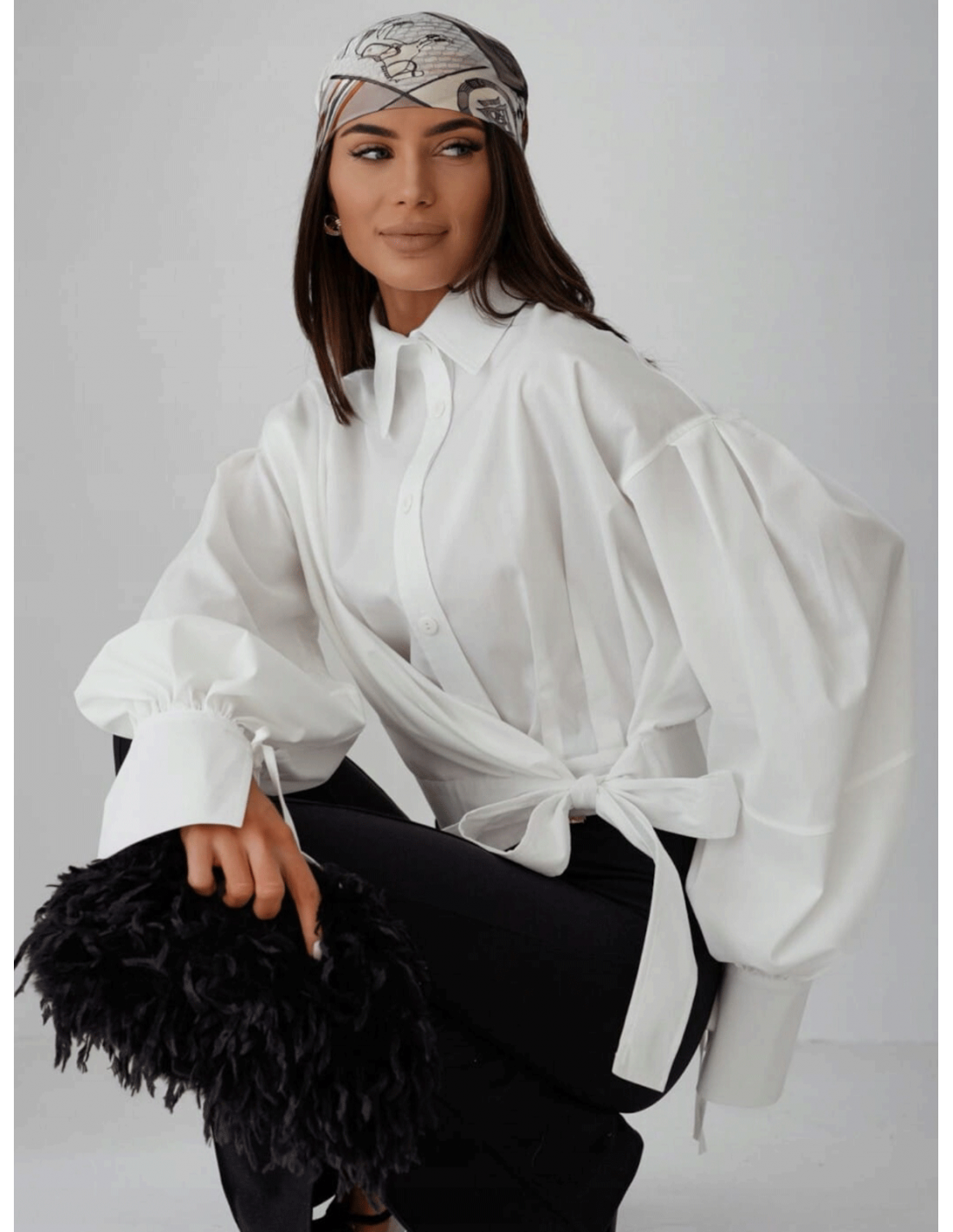 Elegancka bawełniana koszula z wiązaniem VENORA - biała