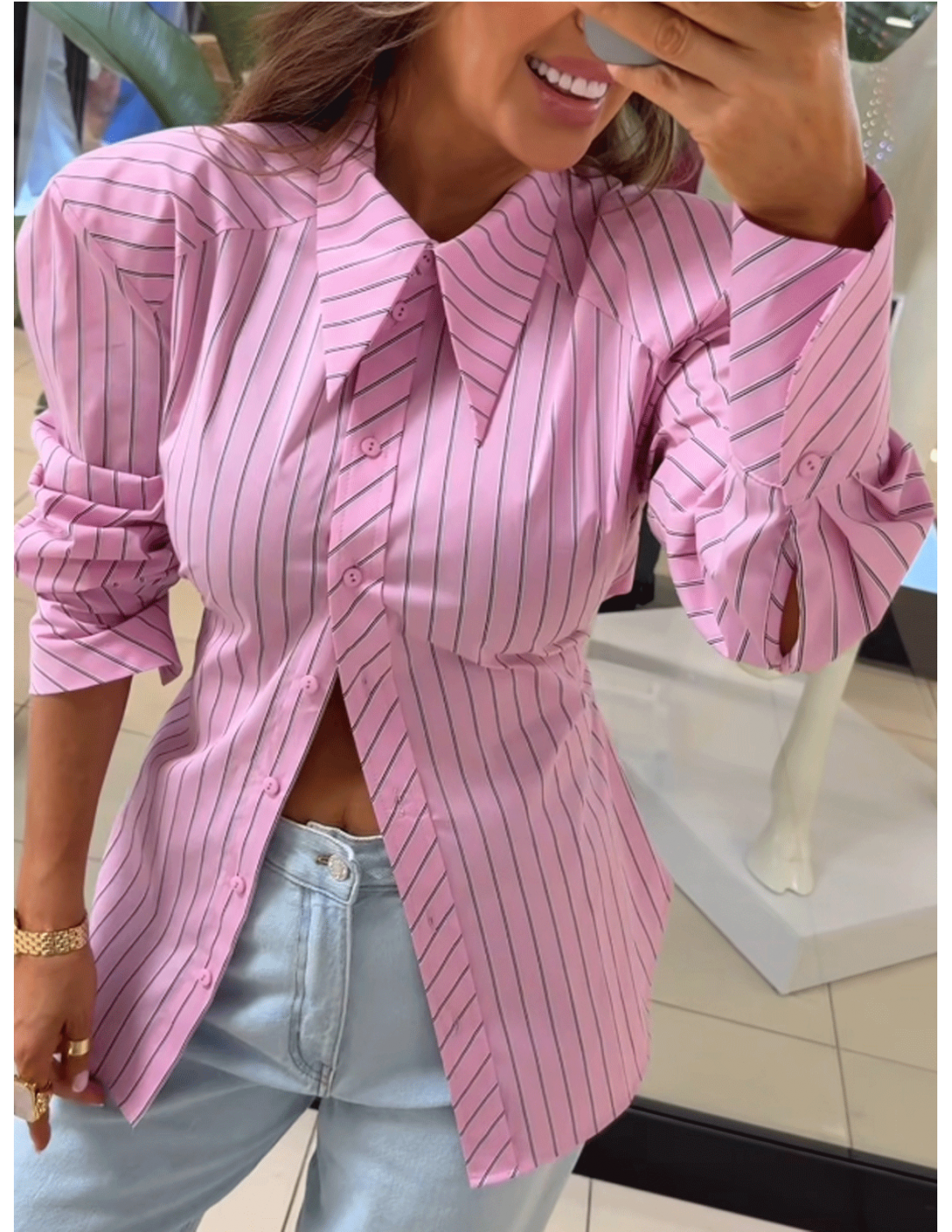 Pionowe paski optycznie wysmuklają i dodają elegancji, a poduszki na ramionach nadają całości nowoczesnego, wyrazistego charakteru.