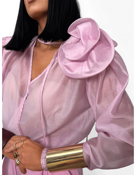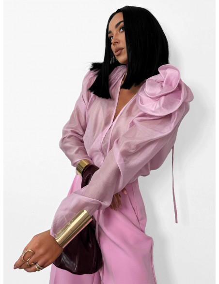 Wiskozowa bluzka koszulowa z kwiatem w kolorze różowym zachwyca lekkością i kobiecym charakterem.