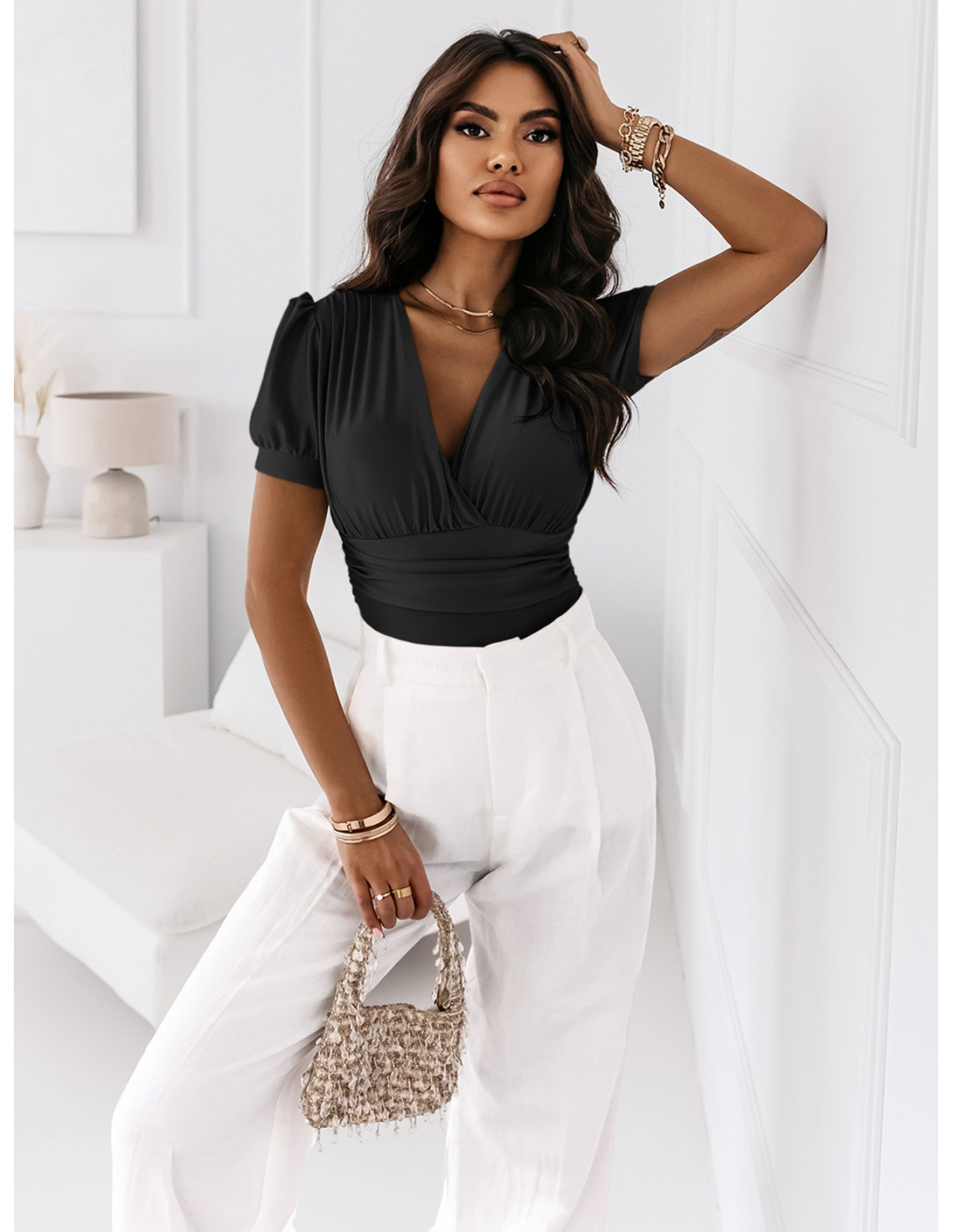 Satynowe body z krótkim rękawem - SELANA - czarne