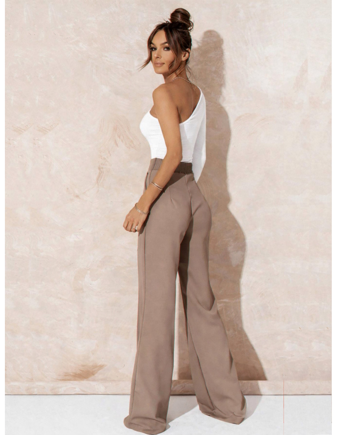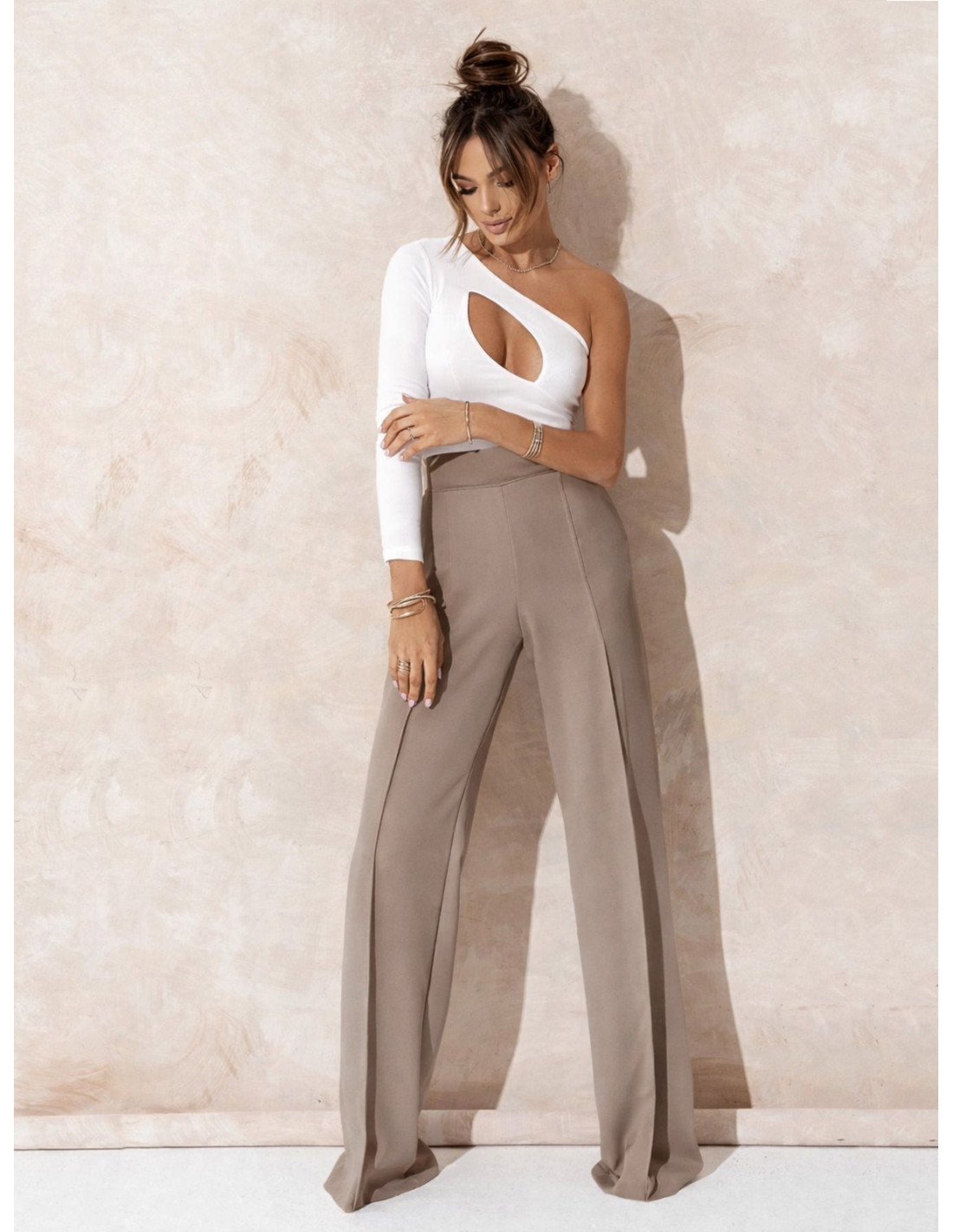 Model z odkrytym ramieniem pięknie akcentuje linię szyi i ramion, dodając stylizacji nowoczesnego, modowego charakteru.