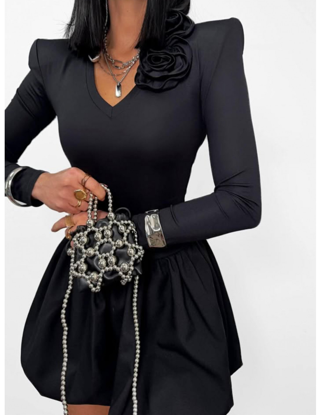 Całość dopełnia efektowny detal z ozdobnym kwiatem, który nadaje stylizacji wyjątkowego, modowego akcentu.