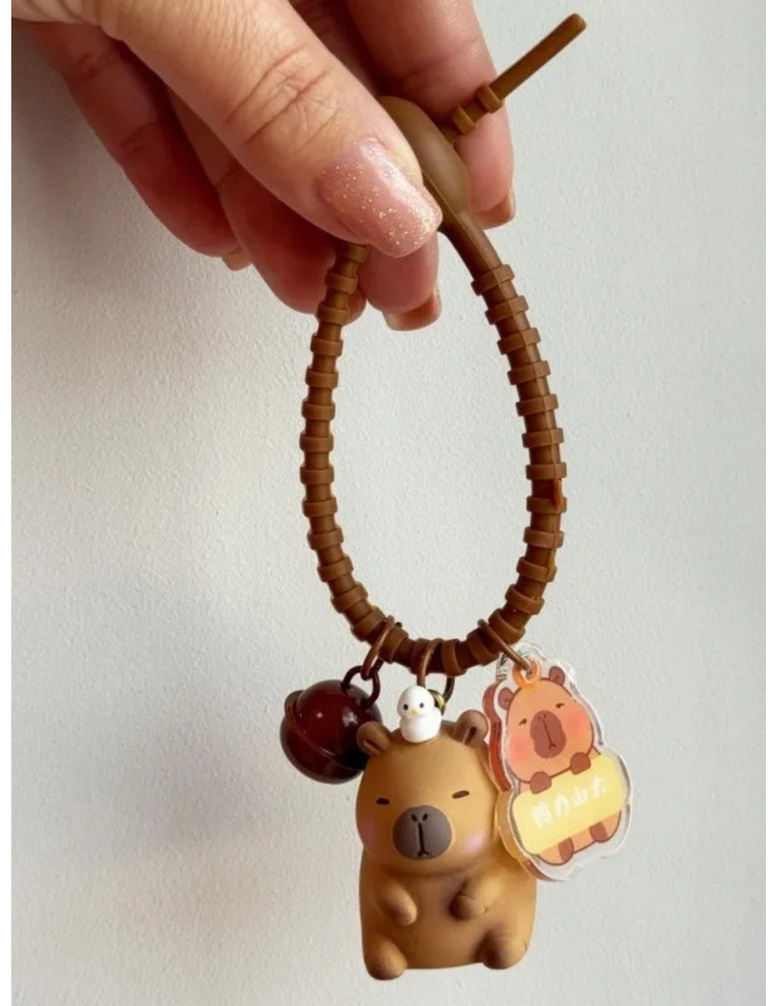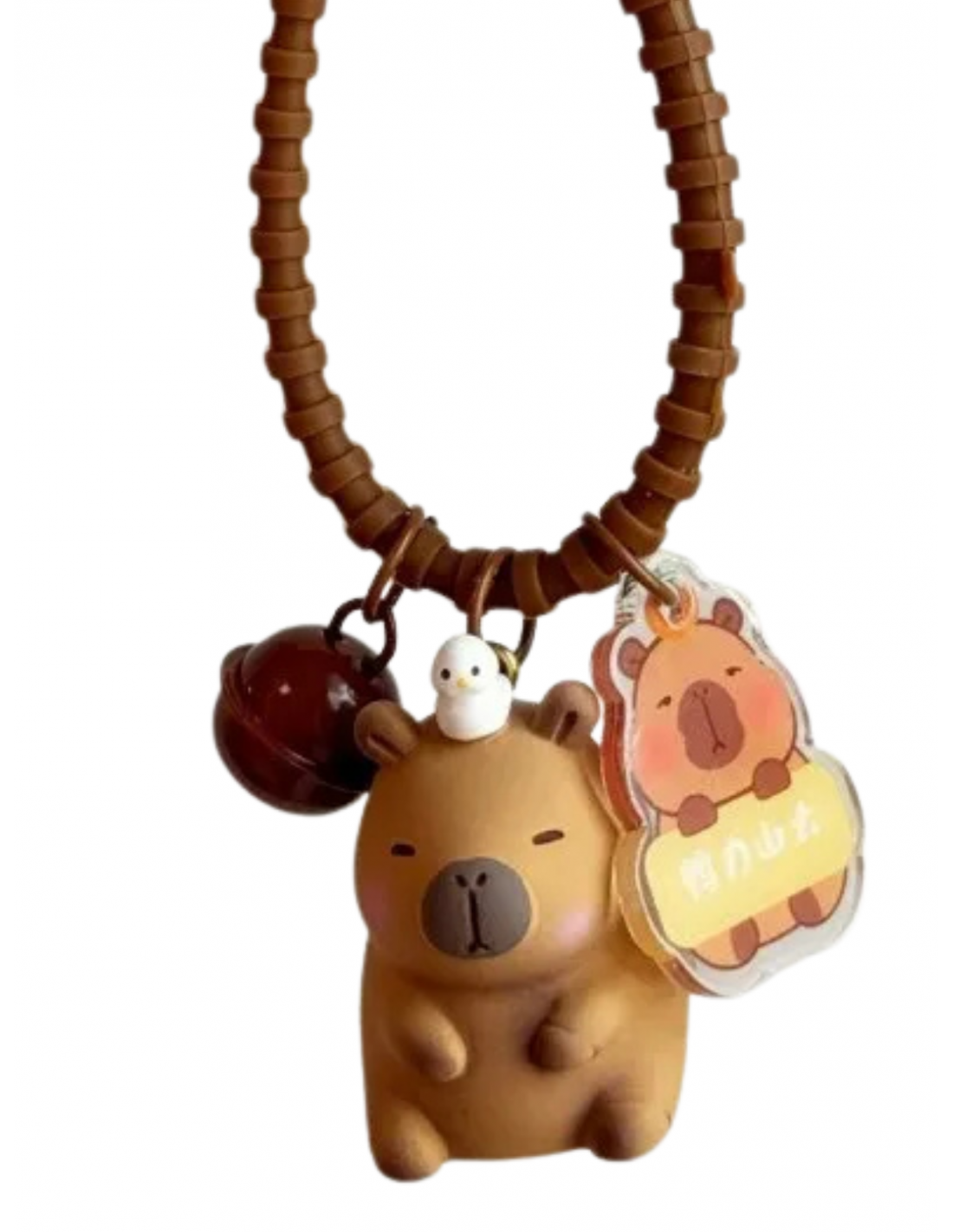 Dodatkowe zawieszki – dzwoneczek oraz akrylowa ilustracja kapibary – podkreślają jego słodki, zabawny styl.