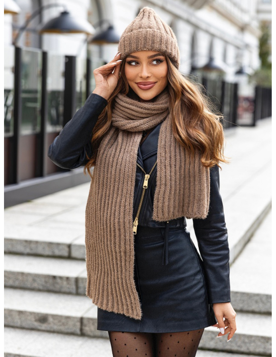 Postaw na komplet - czapkę i szalik w kolorze cappuccino, które połączą elegancję z funkcjonalnością tej jesieni i zimy.