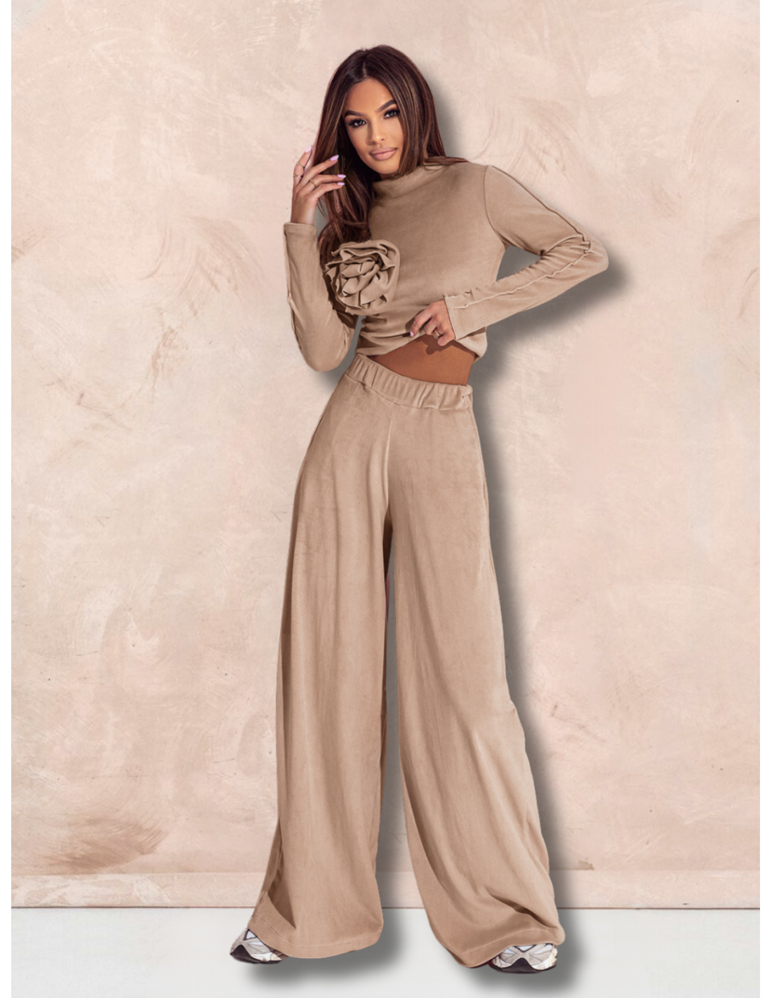 Na froncie bluzy znajduje się subtelna róża, wykonana z tego samego weluru, co dodaje całej stylizacji głębi i wyjątkowości.