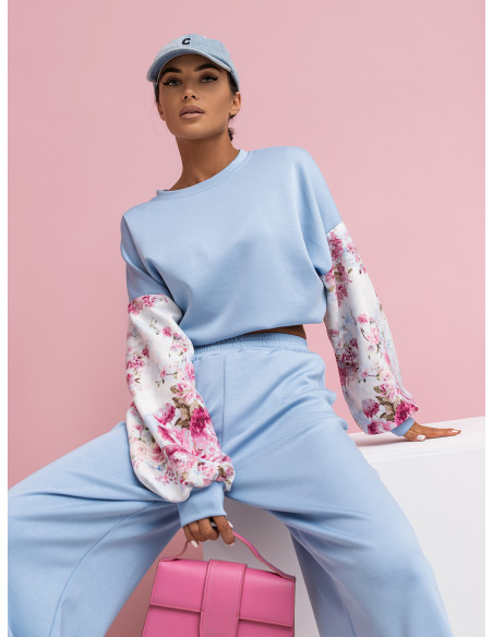 Krótka bluza o luźniejszym fasonie subtelnie podkreśla talię, a efektowne, kwiatowe rękawy dodają całości romantycznego charakteru.