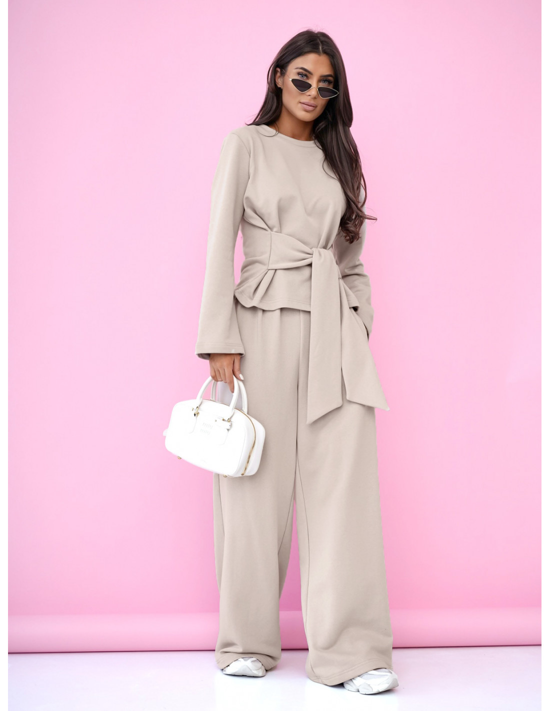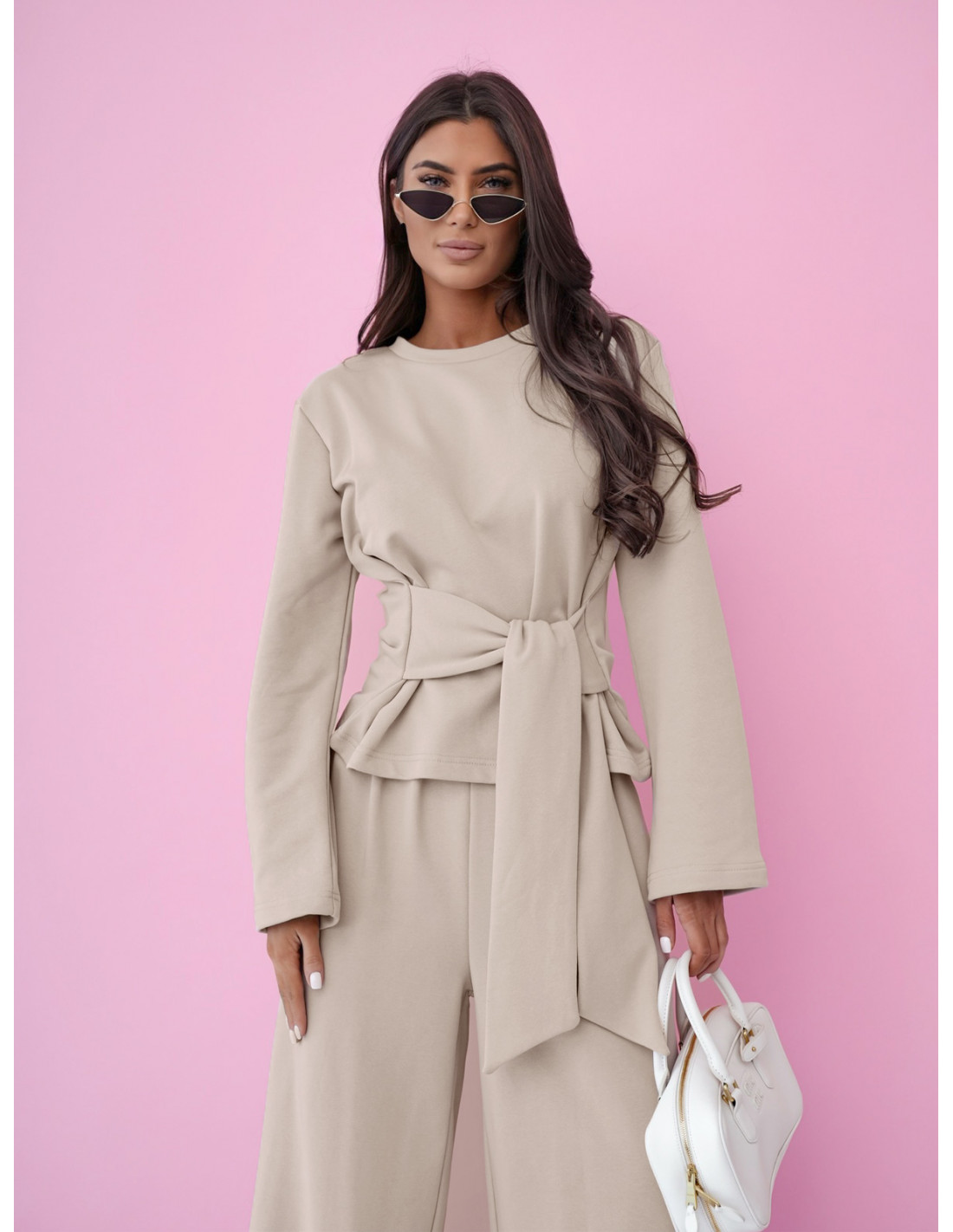 Górę stanowi stylowa bluza z szerokimi rękawami i wiązaniem w talii, dzięki której możesz pięknie podkreślić sylwetkę i nadać całości modowego charakteru.