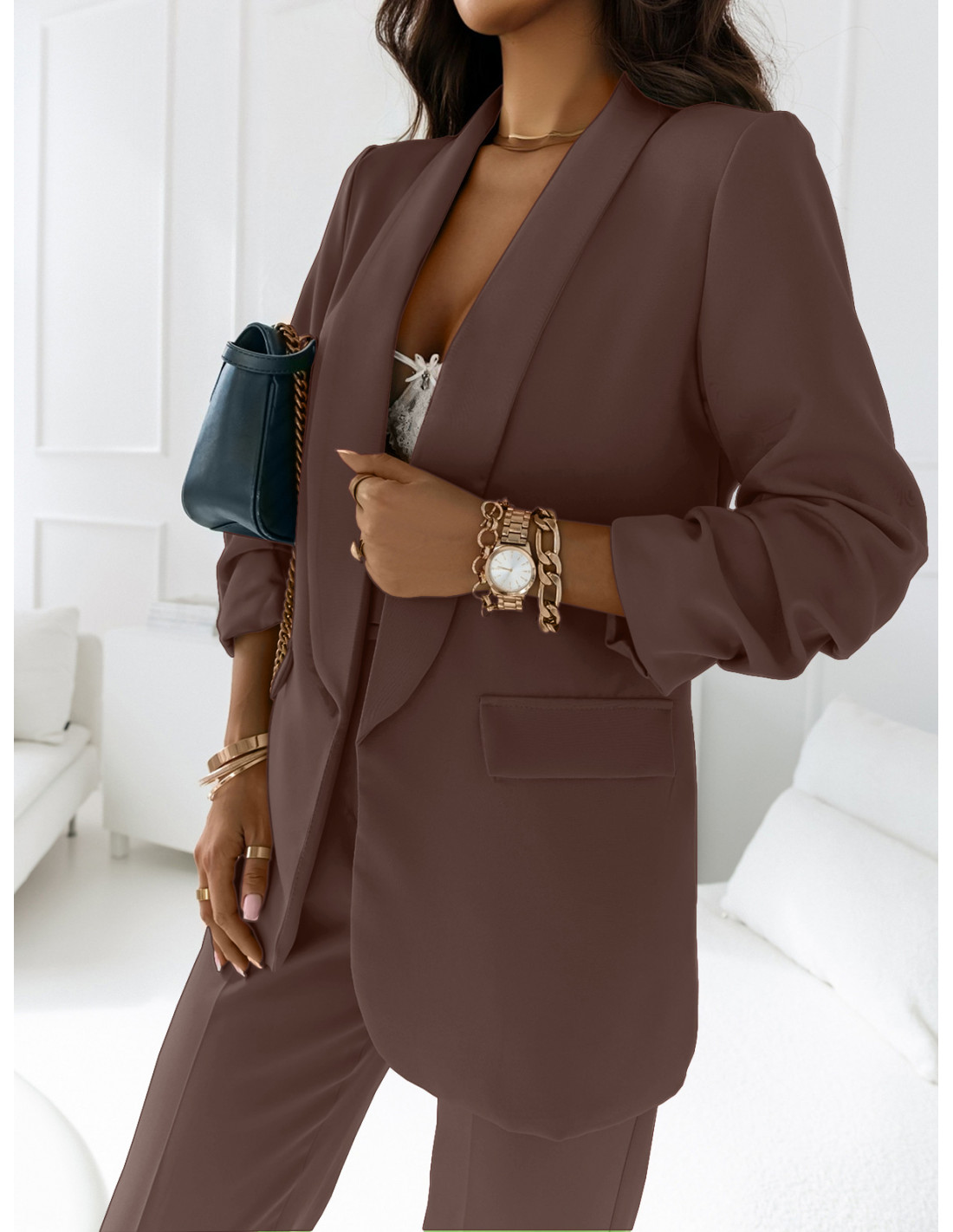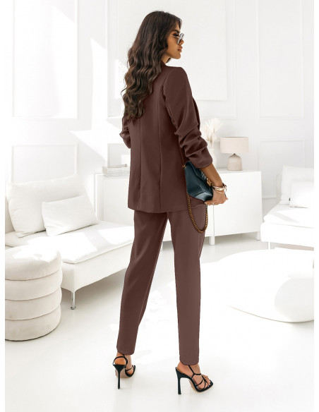 Postaw na styl, który zachwyca klasą i nowoczesnym charakterem – elegancki komplet garniturowy w głębokim odcieniu czekolady to must-have każdej modnej kobiety.