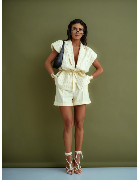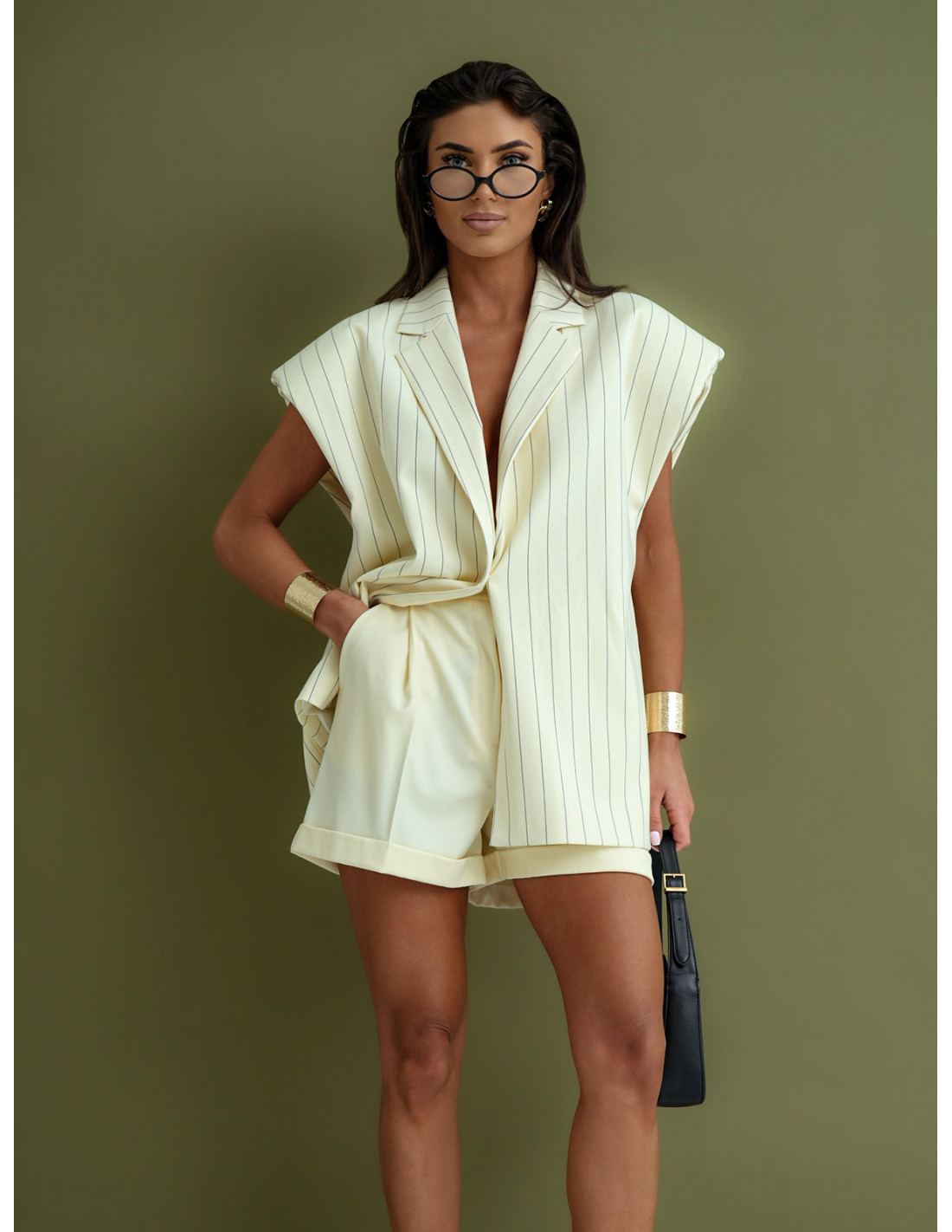 Ta stylowa waniliowa kamizelka w paski to wyjątkowy element garderoby, który doskonale łączy elegancję z nowoczesnym, modowym charakterem.