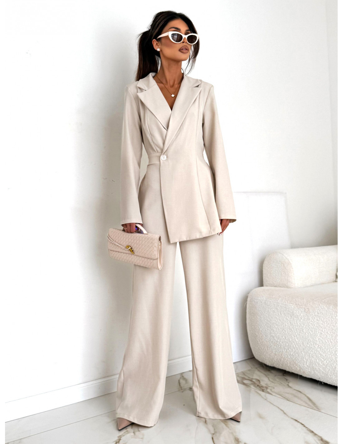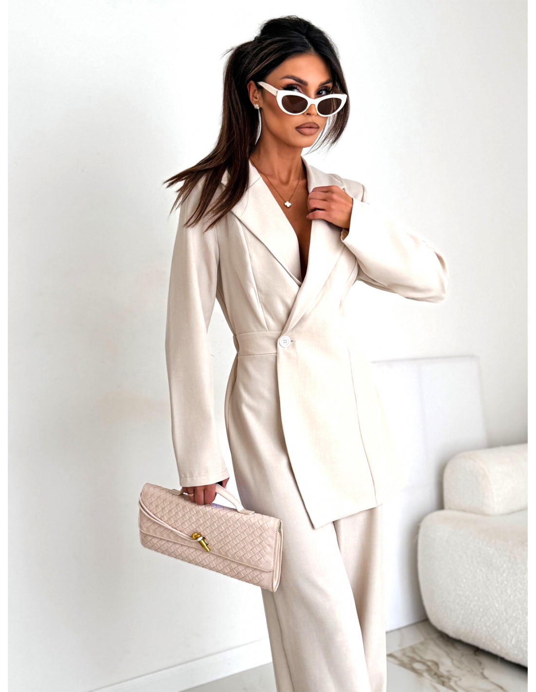Góra o kroju marynarki pięknie modeluje sylwetkę i nadaje stylizacji wyrafinowanego charakteru.