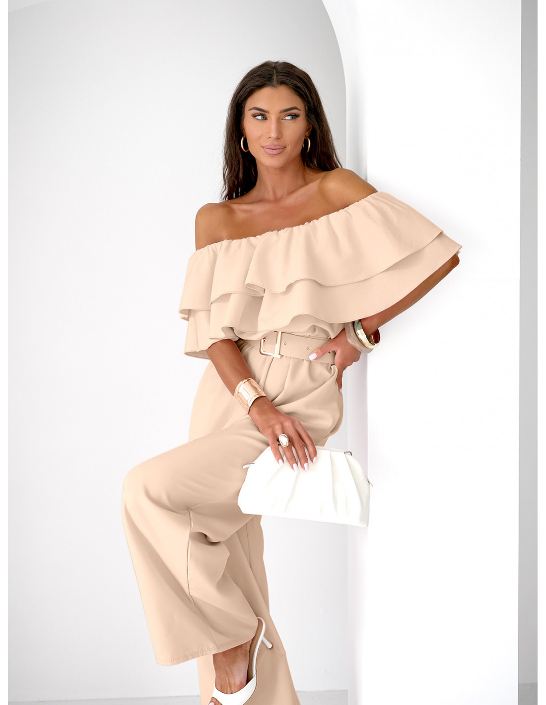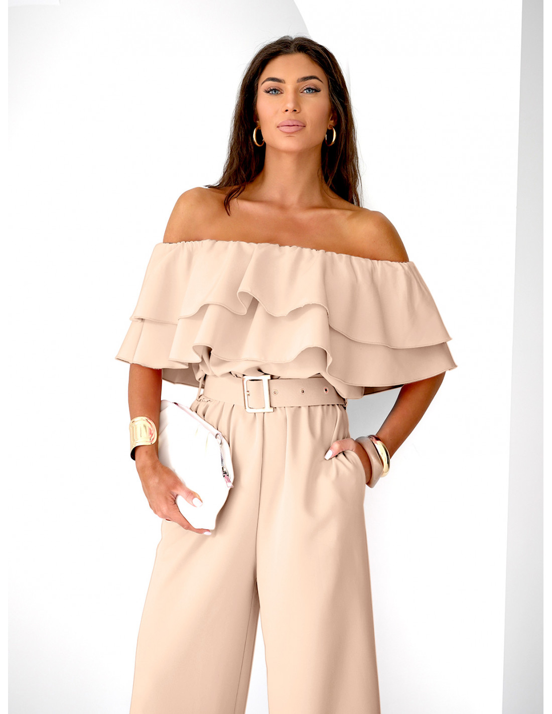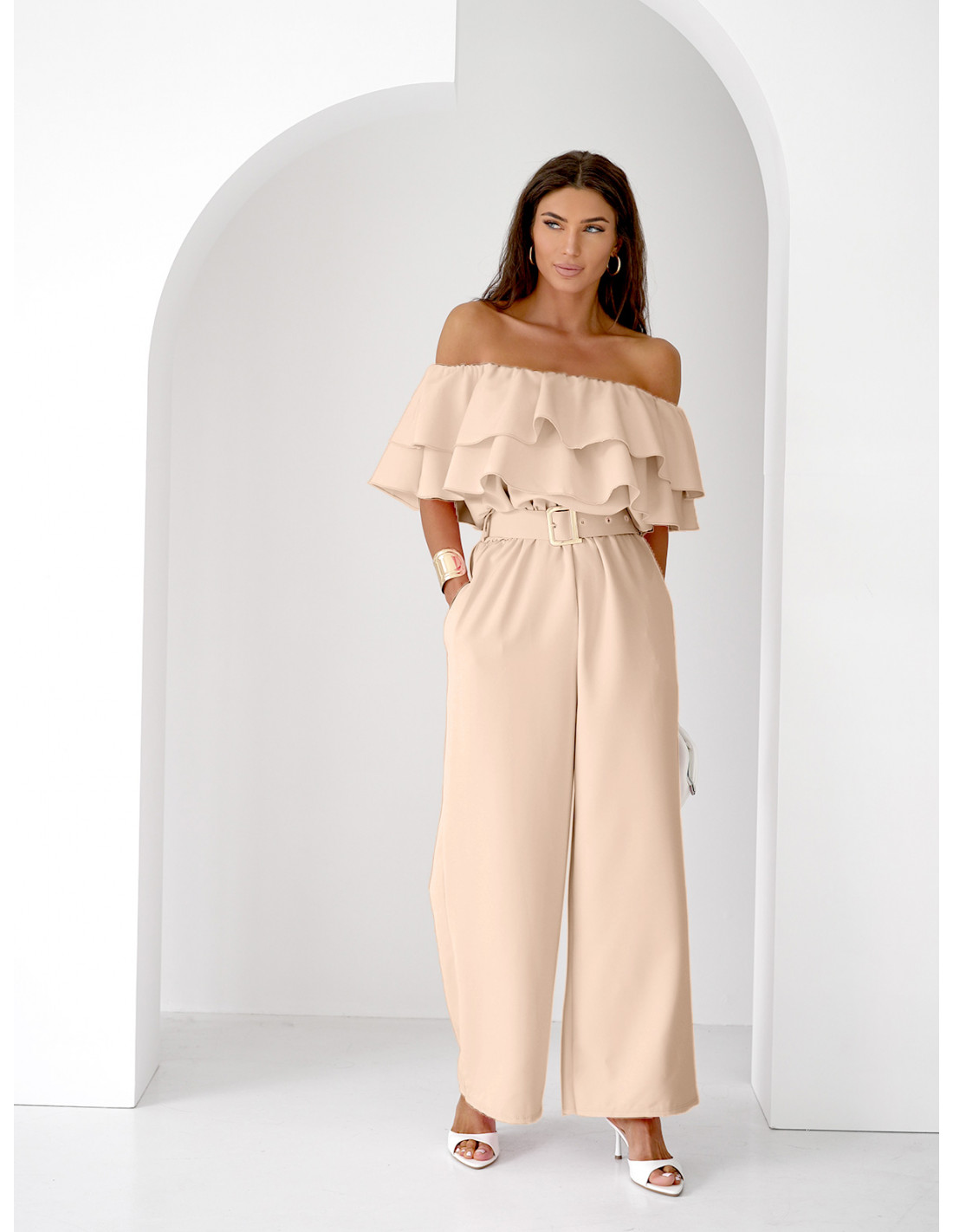 Stylowy kombinezon z odkrytymi ramionami, który pięknie podkreśla kobiecą sylwetkę i dodaje lekkości całej stylizacji.