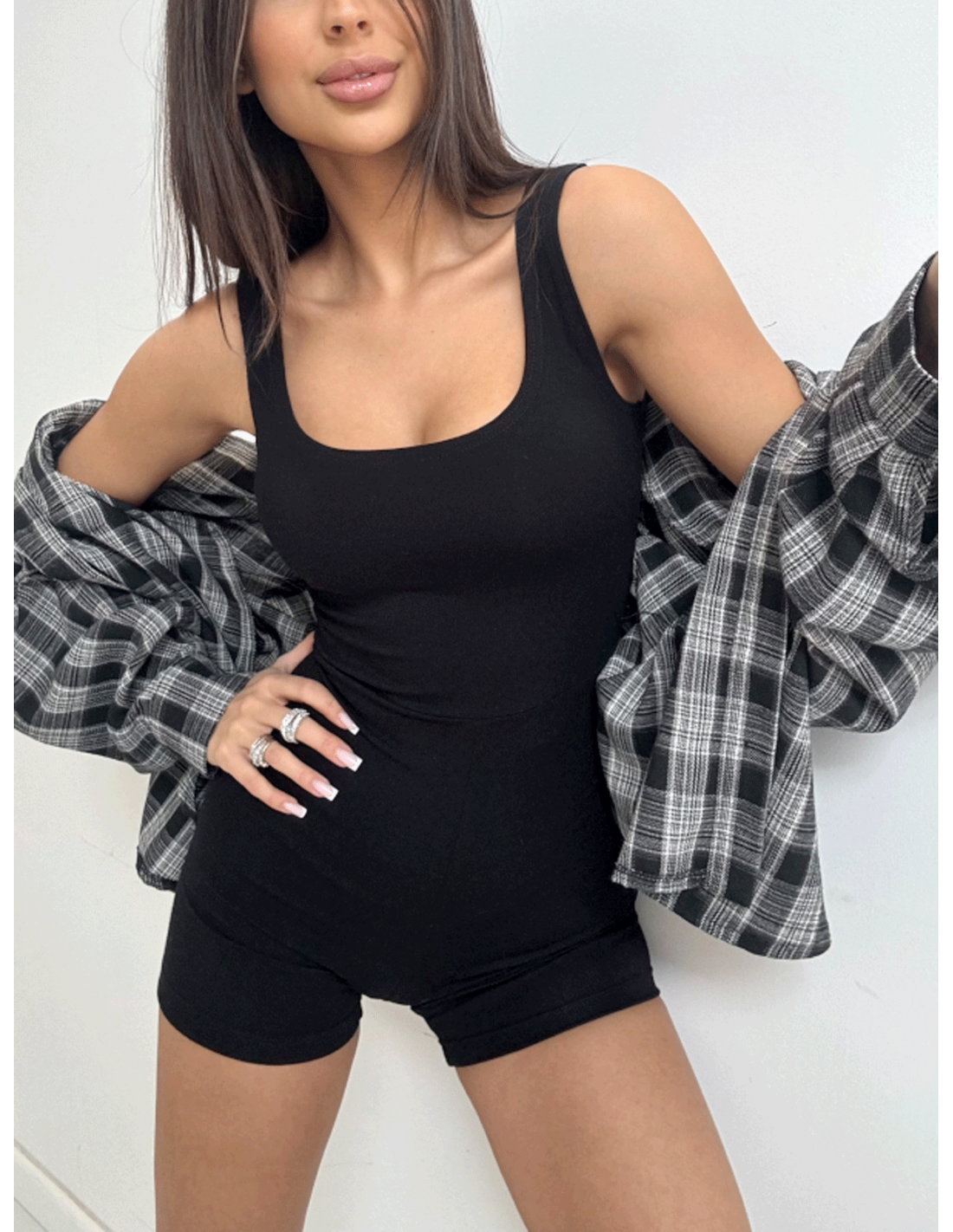 Elastyczny czarny kombinezon z krótkimi nogawkami, który perfekcyjnie podkreśla sylwetkę i dopasowuje się do ciała jak druga skóra.