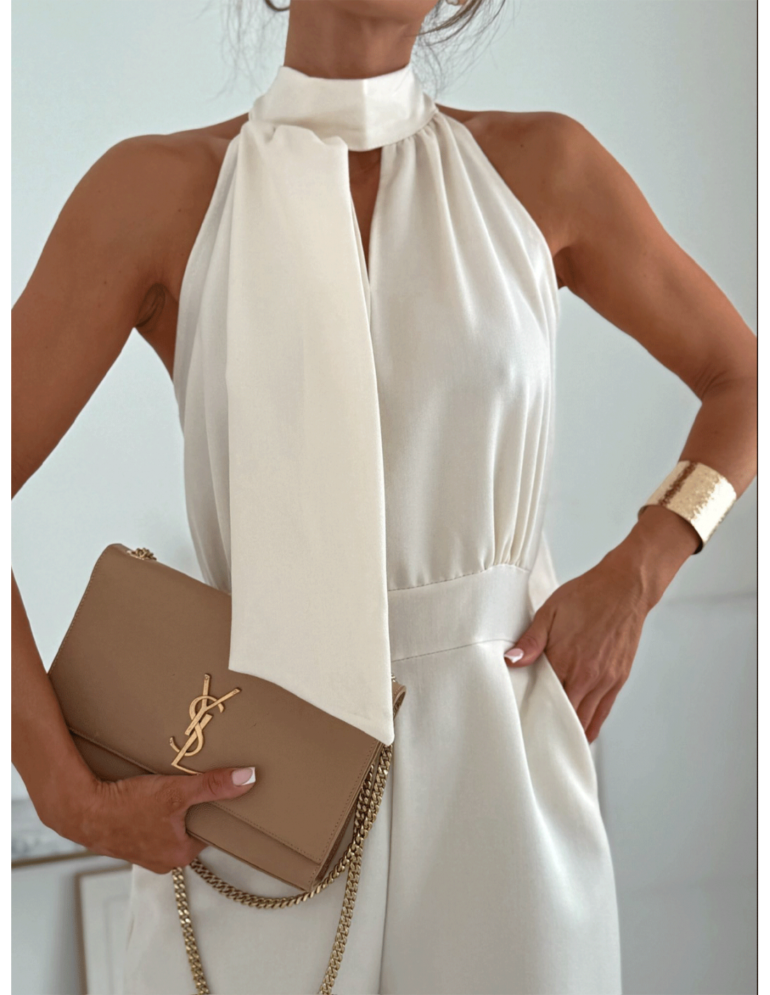 Góra z efektowną stójką i subtelnym wycięciem dodaje szyku, a wiązanie na szyi wraz z dekoracyjną szarfą tworzy wyjątkowy, elegancki akcent.