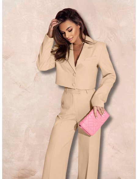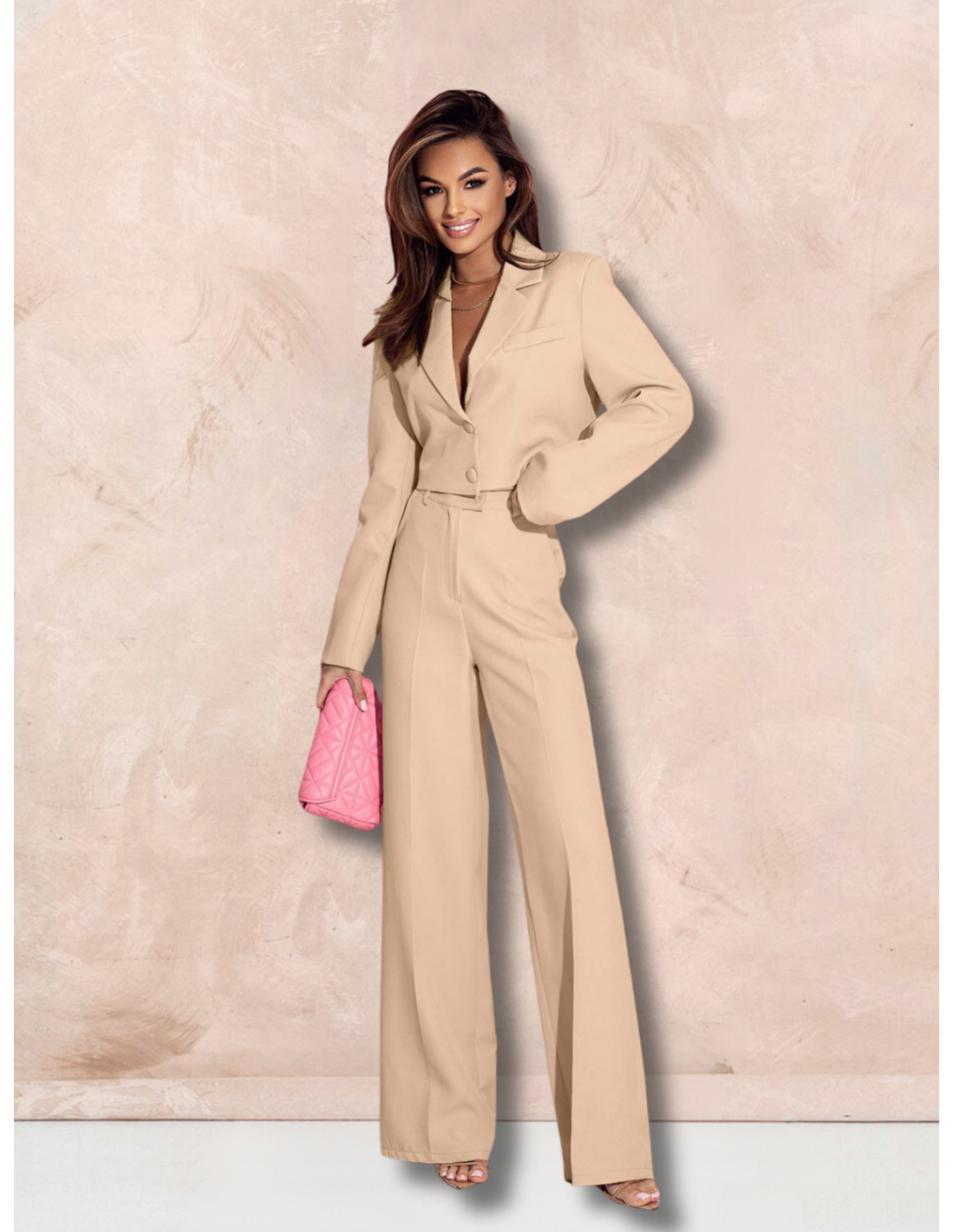 Krótka marynarka zapinana na dwa guziki podkreśli Twoją talię, a szerokie nogawki spodni optycznie wydłużą nogi, gwarantując nienaganną sylwetkę.